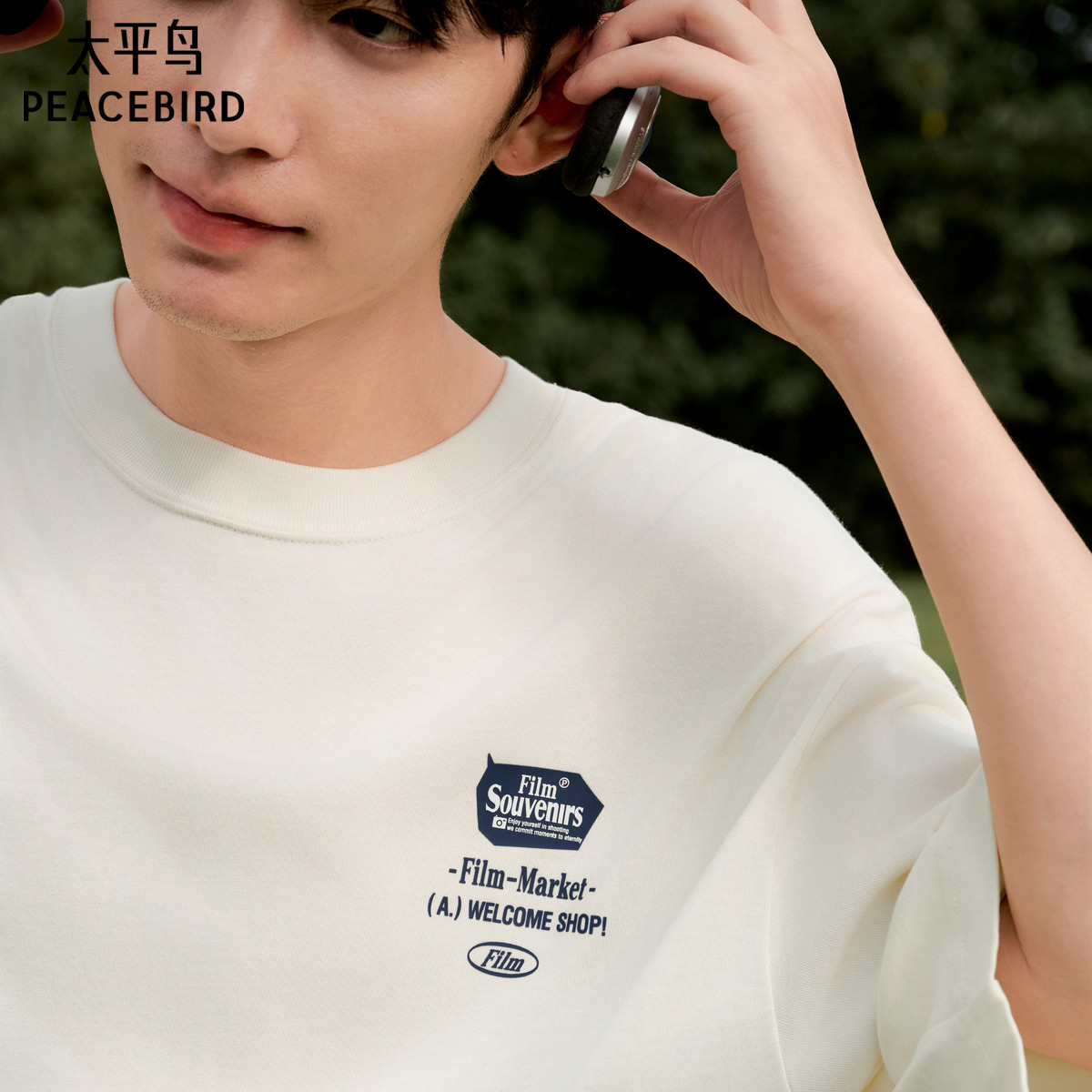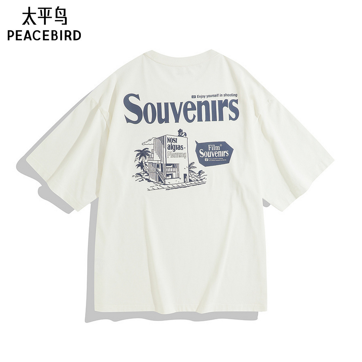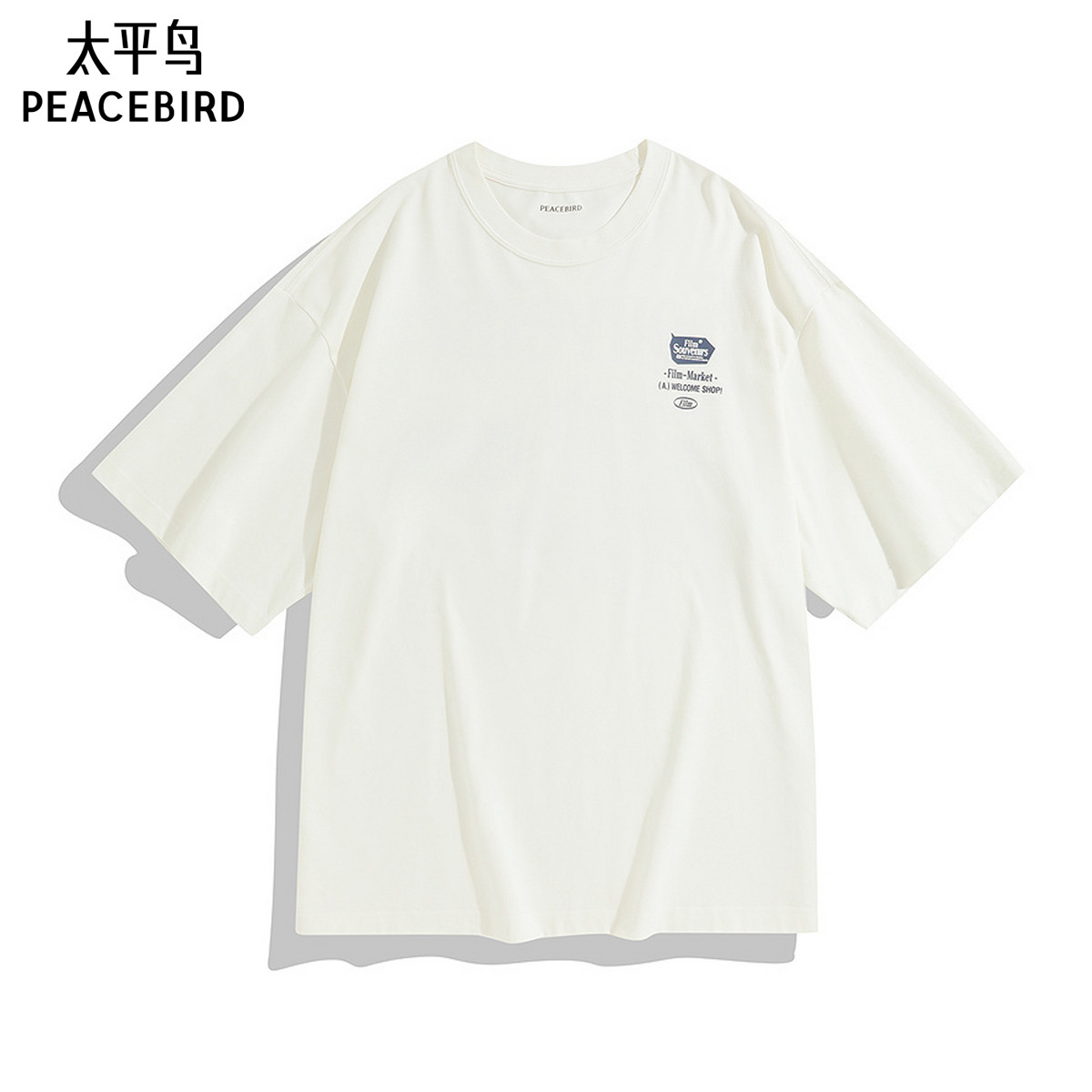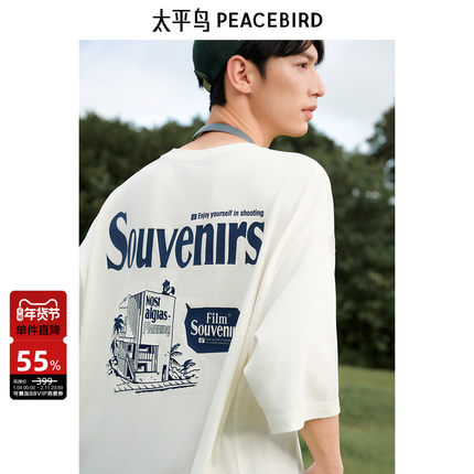 太平鸟男装 美式体恤男印花刺绣白色套头宽松短袖T恤男