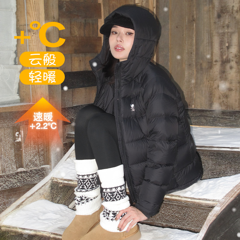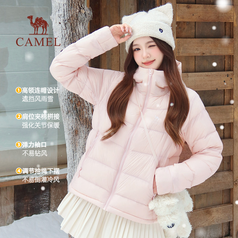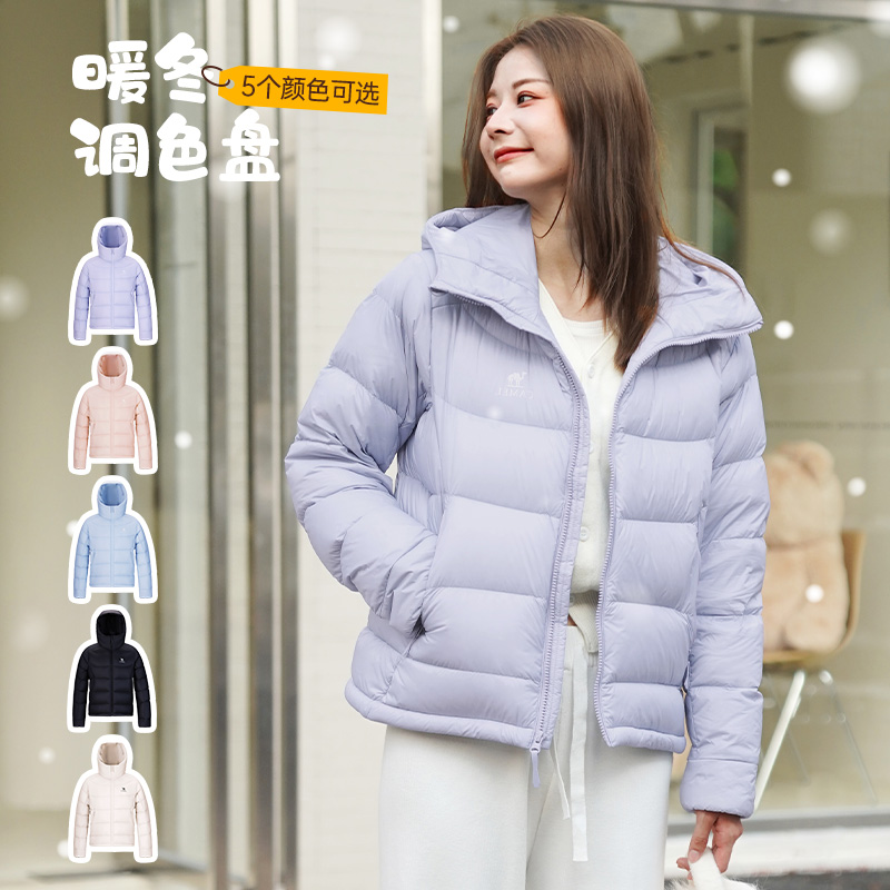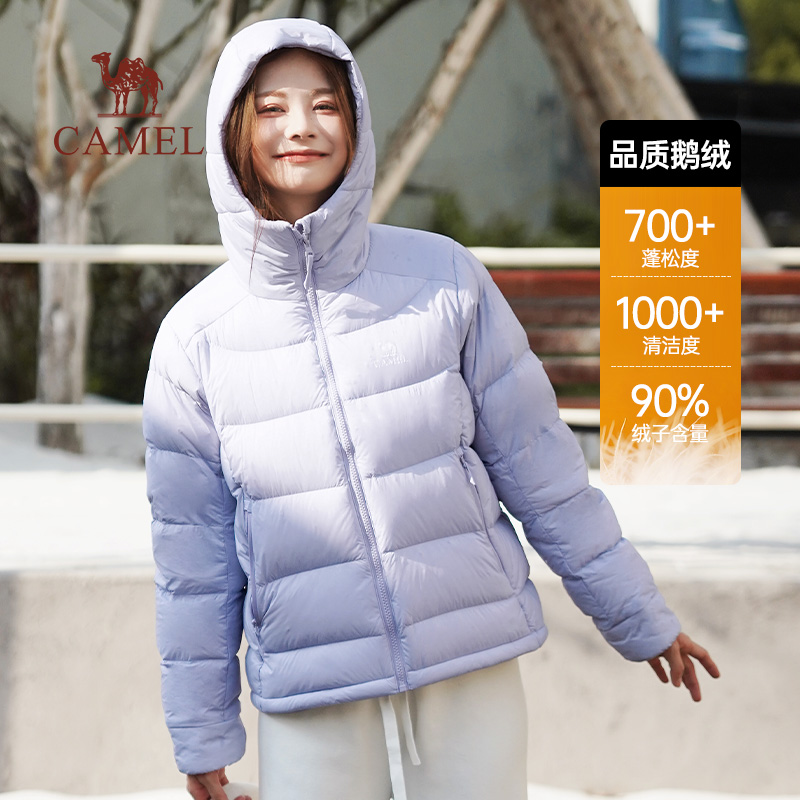 骆驼女装轻薄鹅绒服2025冬季新款连帽保暖加厚短款羽绒服蓝色外套