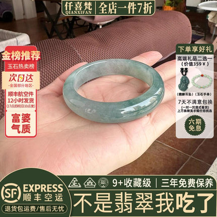 仟喜梵“细雨轻烟”缅甸冰种翡翠玉手镯子女款油青冰飘花真玉处理