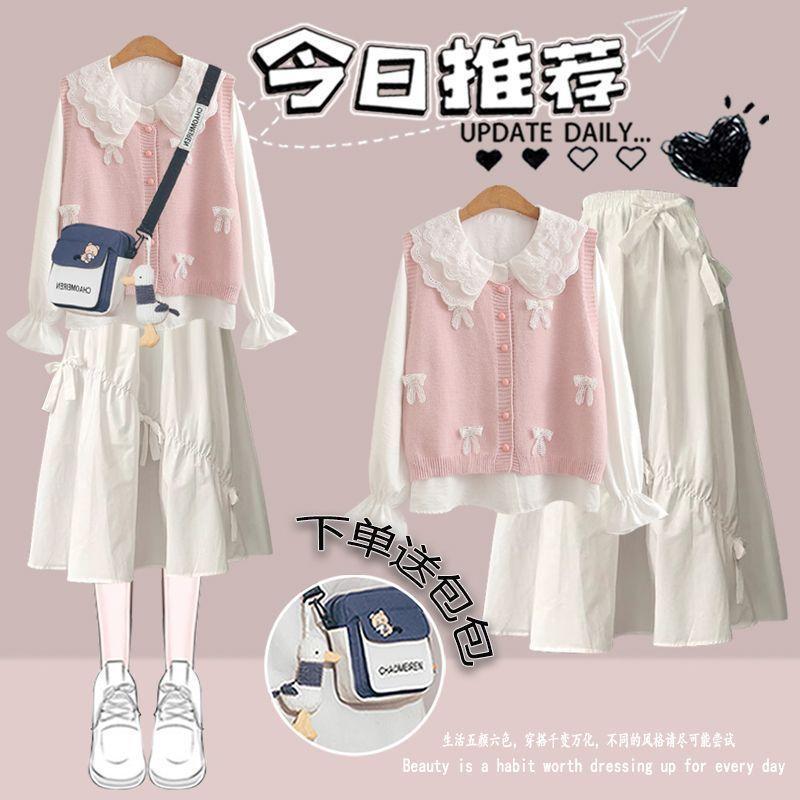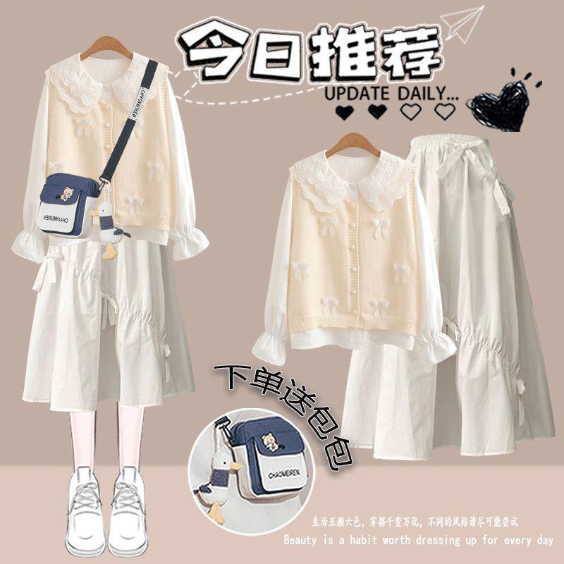 秋季学院风女学生蕾丝娃娃领长袖衬衫加针织马甲+高腰半身裙套装