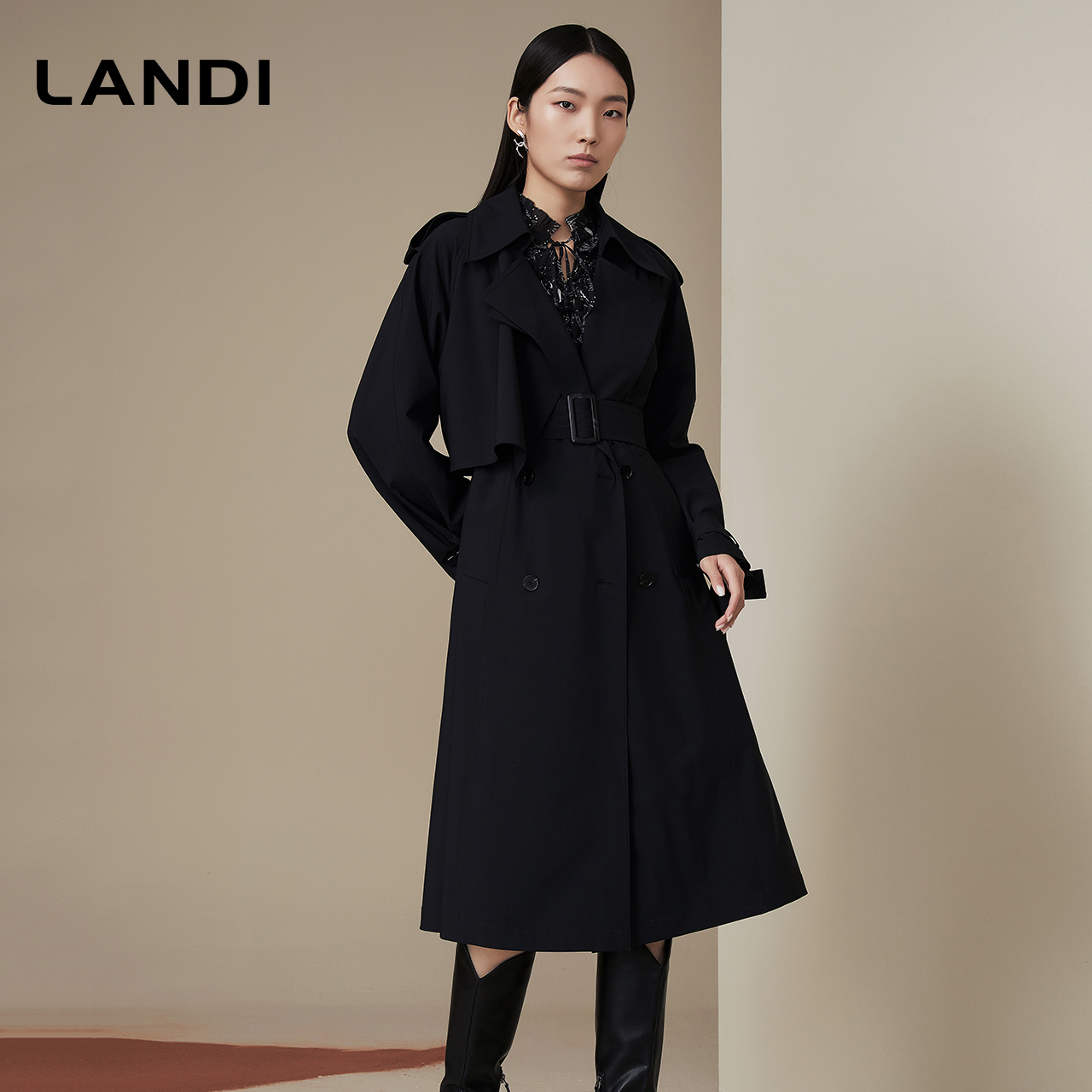 LANDI蓝地黑色经典款设计感系带收腰风衣外套女大衣中长款秋新品