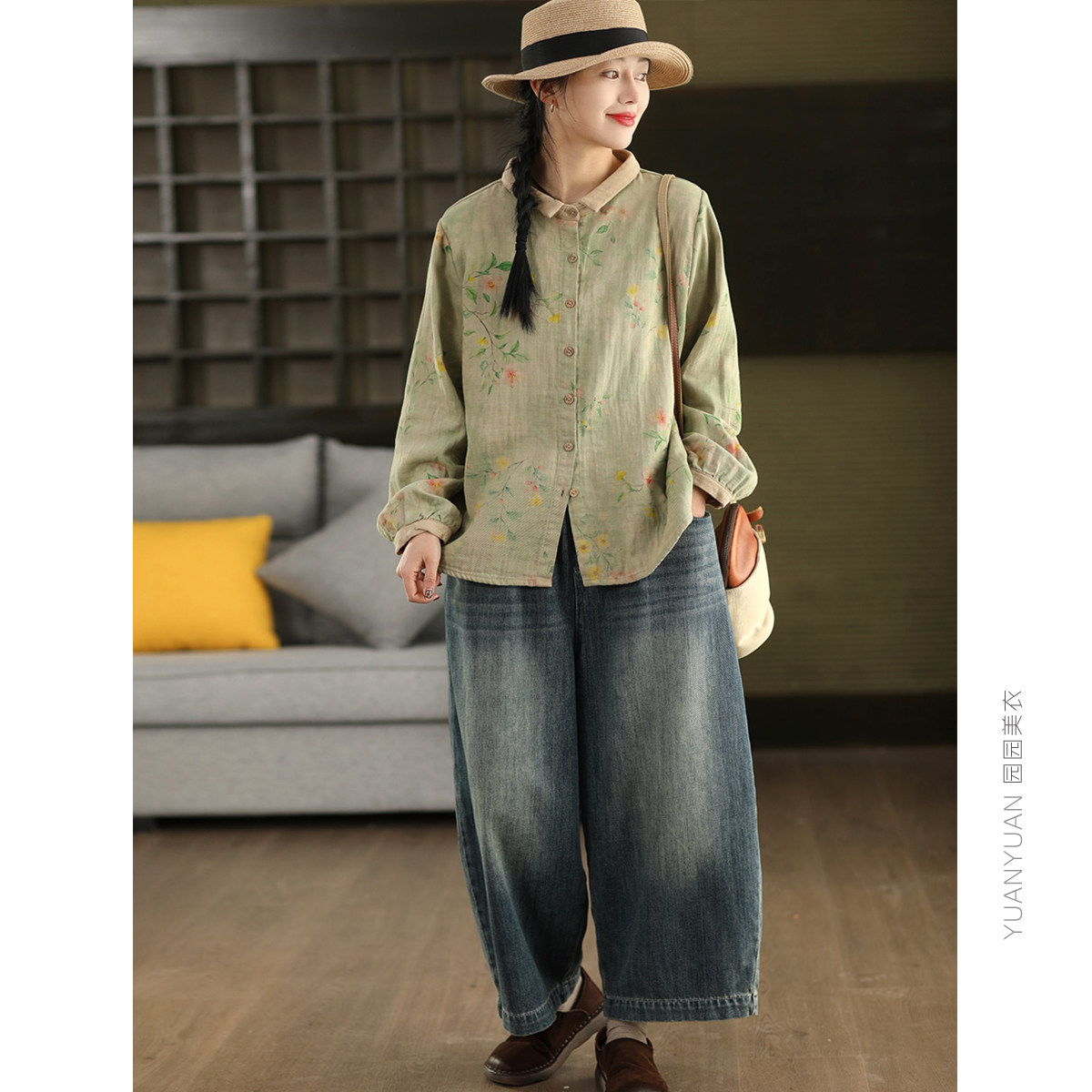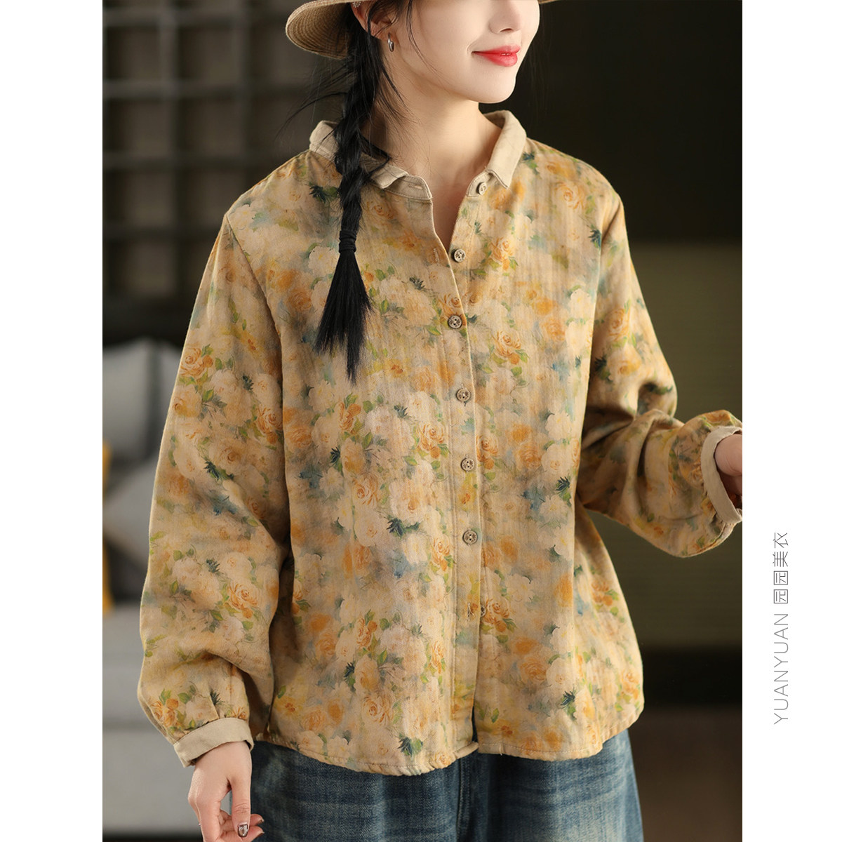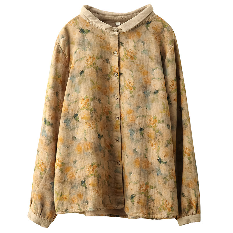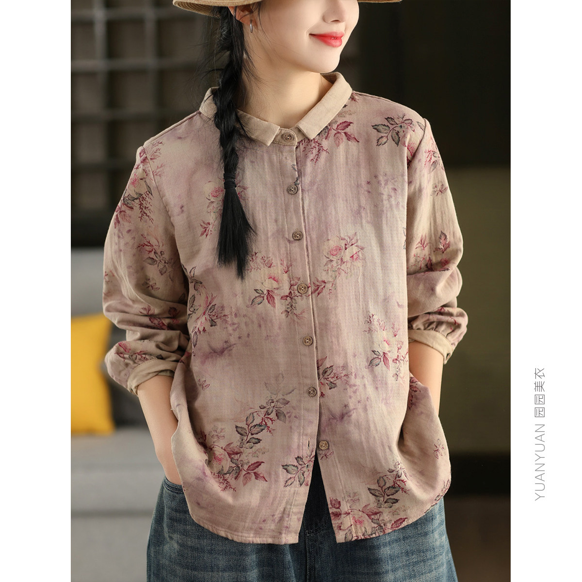 园园美衣复古炒染印花100%棉衬衫女春款文艺碎花长袖衬衣气质上衣
