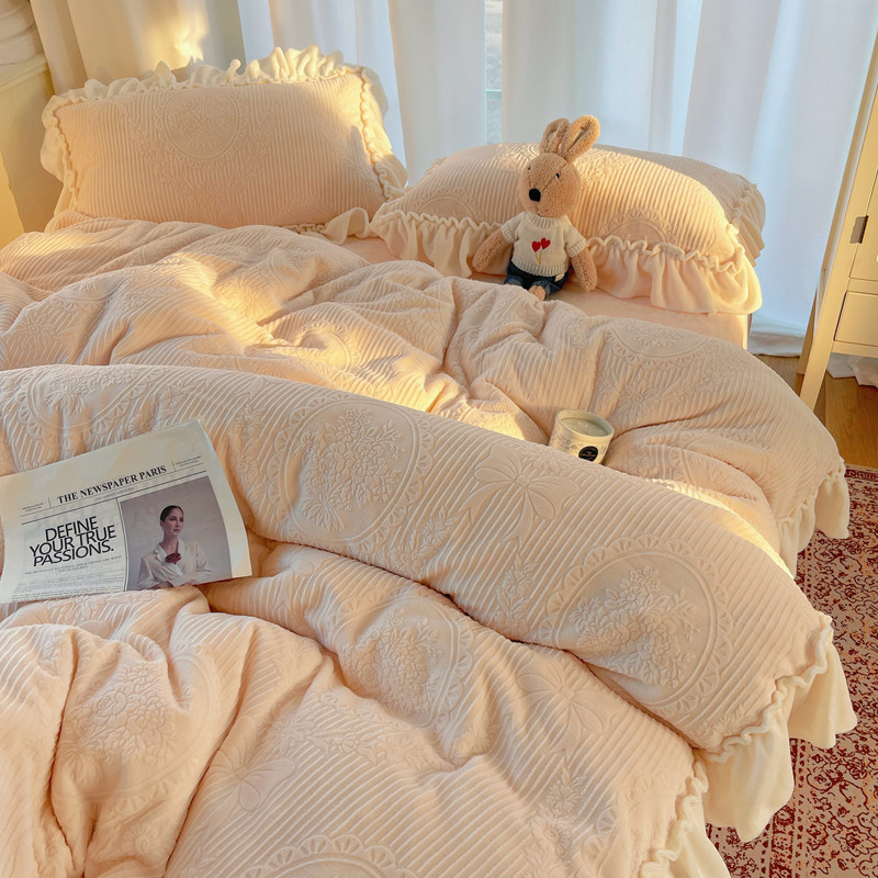 秋冬法式浪漫粉花边公主风牛奶绒四件套雕花绒被套珊瑚绒床单床笠