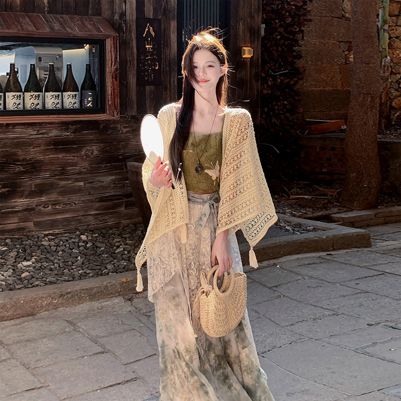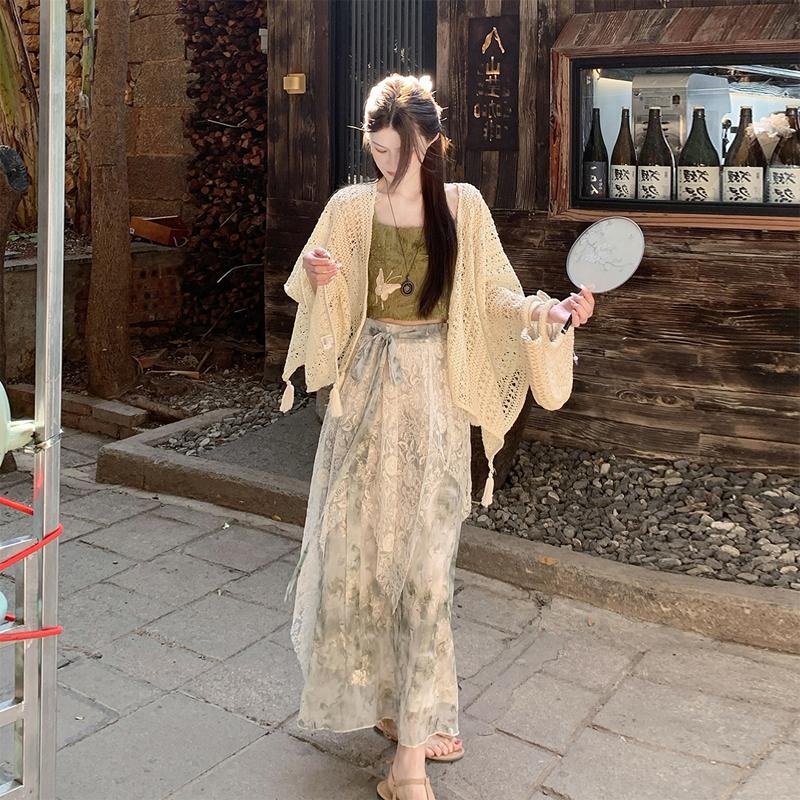 新中式国风套装夏季云南旅游穿搭女装开衫吊带水墨半身裙子三件套