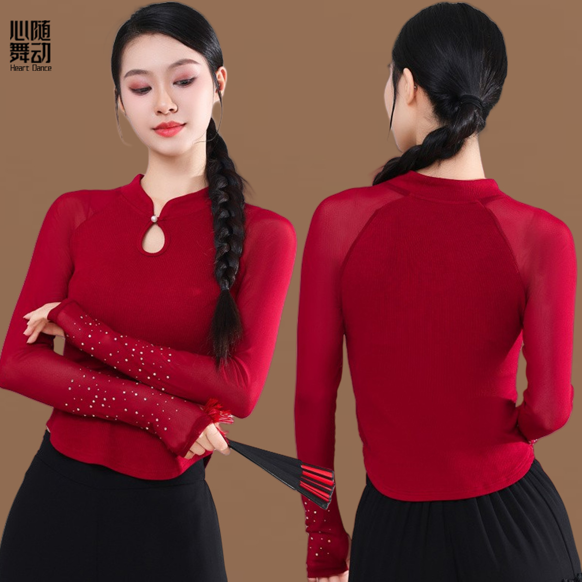 广场舞民族风古典舞服修身拼接纱袖上衣扇子舞跳舞民族舞服装女