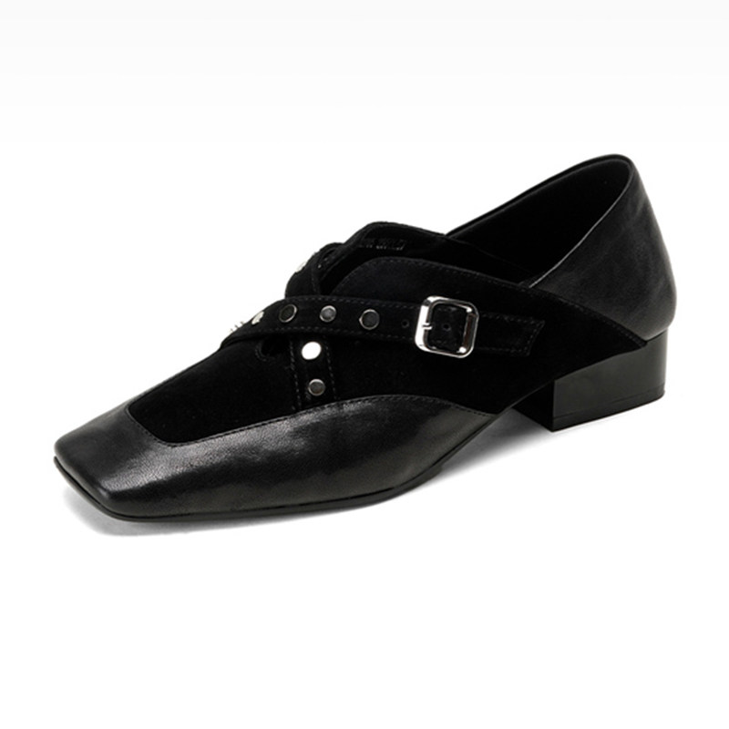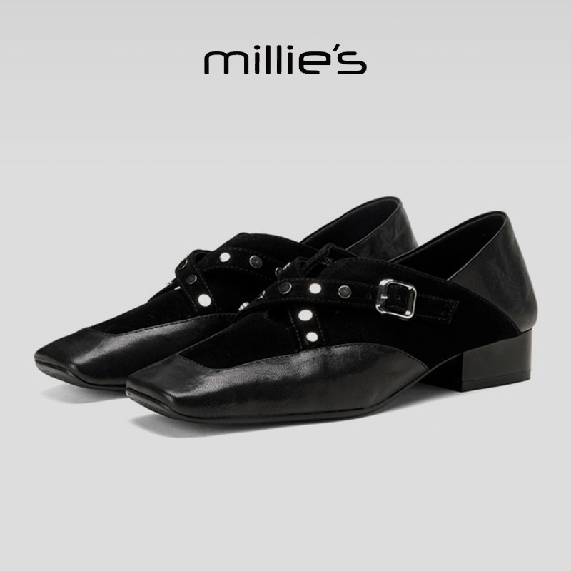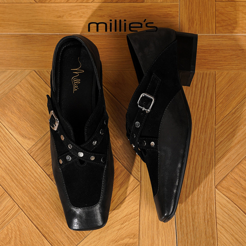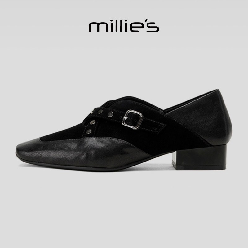 MILLIE'S/妙丽2025新款方头单鞋女粗跟小皮鞋时尚皮带扣深口中跟