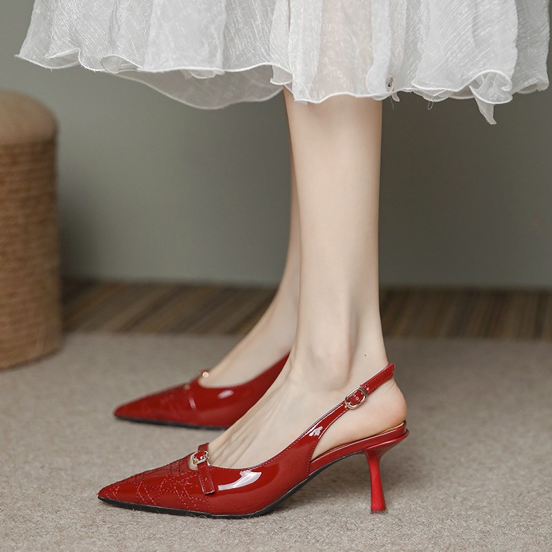 酒红色细跟尖头高跟凉鞋女2024年夏新款不累脚7厘米礼服软皮单鞋