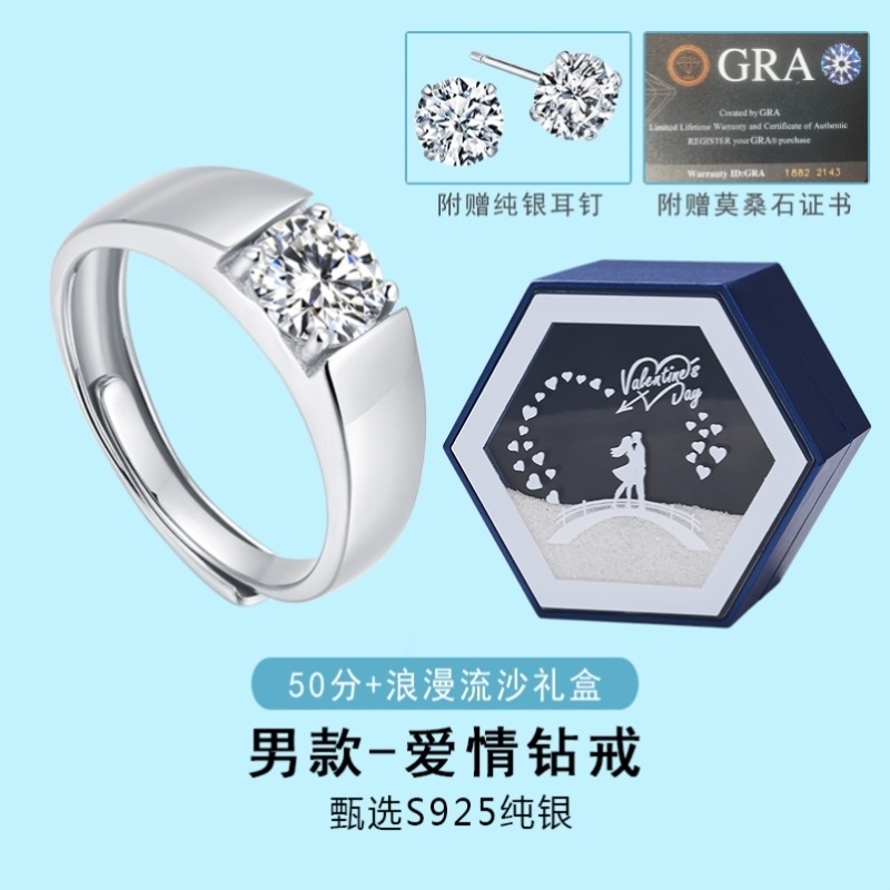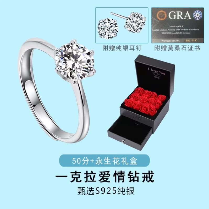 S925纯银女莫桑石钻戒仿真钻石戒指求婚情侣对戒子生日礼物送女友