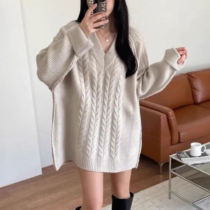 韩国chic秋冬法式慵懒风V领宽松中长款长袖麻花针织毛衣连衣裙女