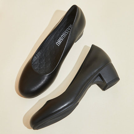 圆头粗跟4cm黑色女皮鞋工作鞋公务员面试上班职业正装空姐鞋单鞋