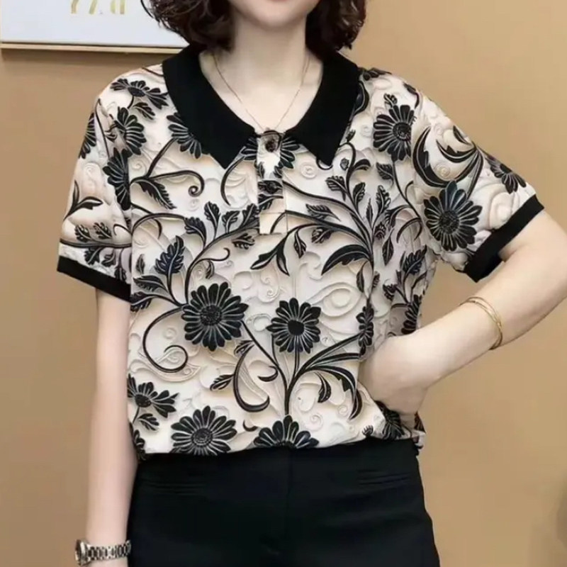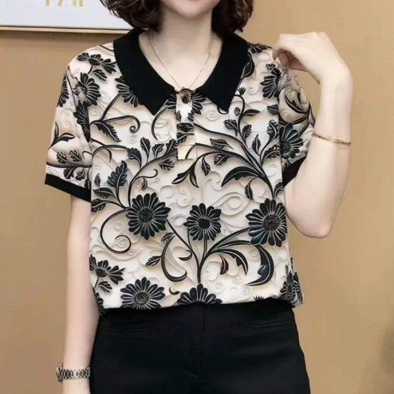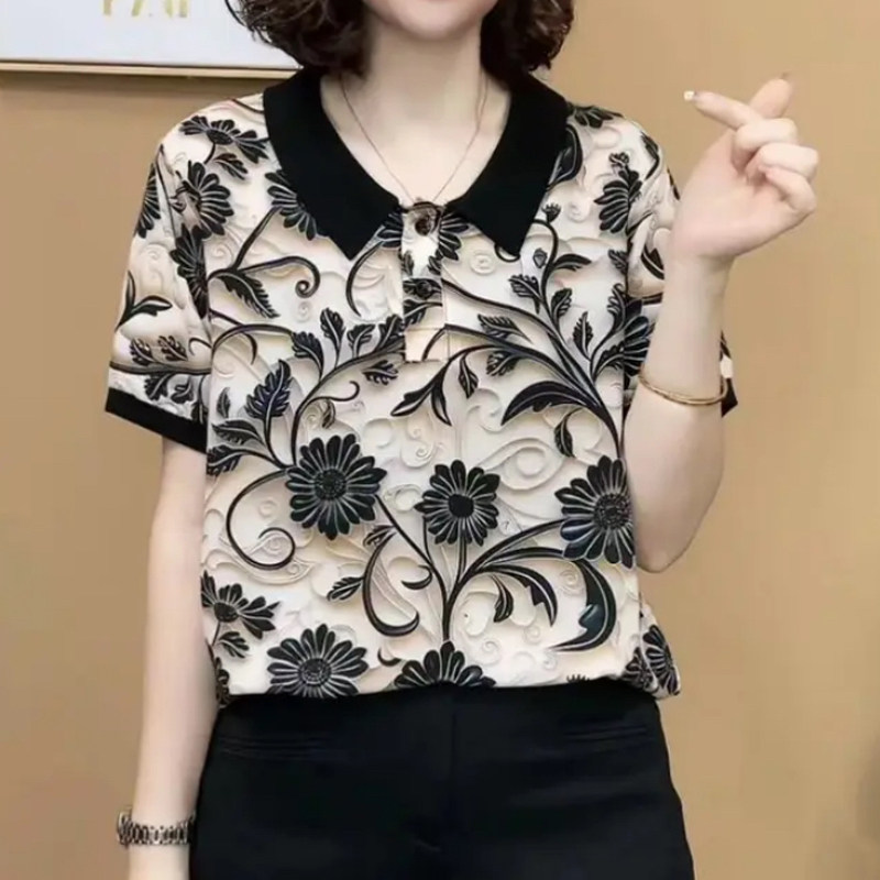 妈妈装Polo领洋气雪纺印花小衫时尚女夏季短袖T恤减龄百搭女上衣