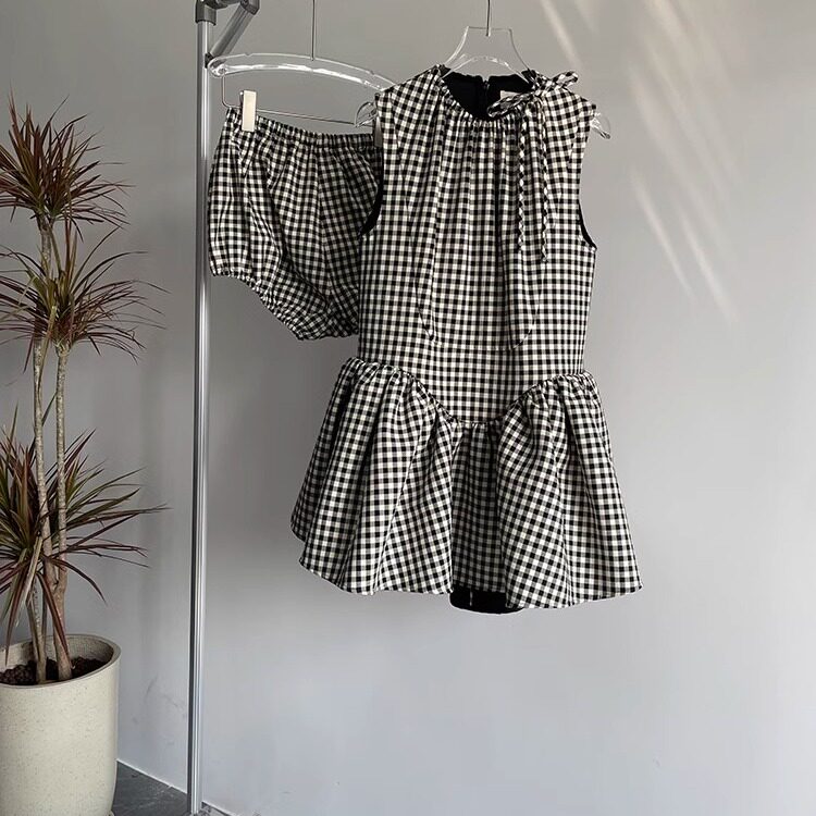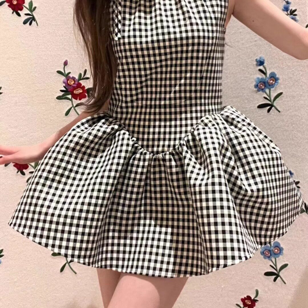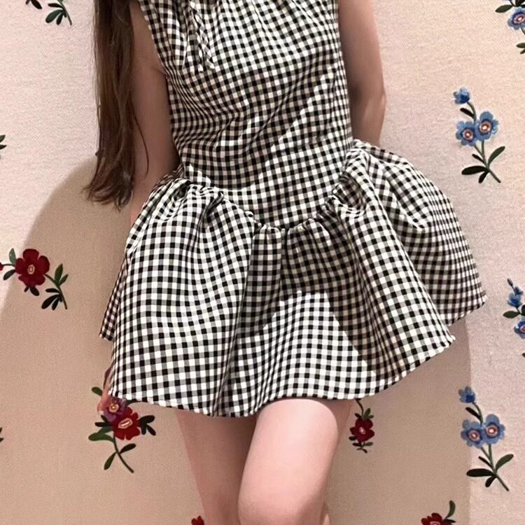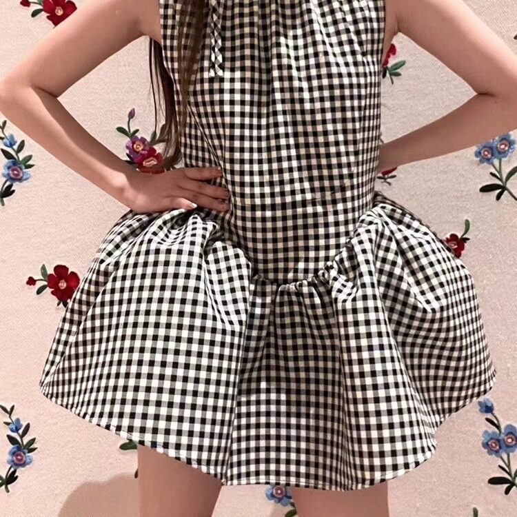 田曦薇同款黑白格子无袖连衣裙女夏季收腰小个子娃娃蓬蓬裙短裙子