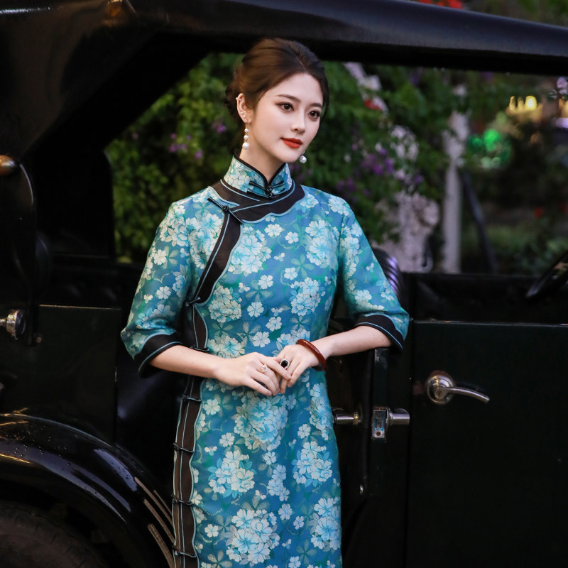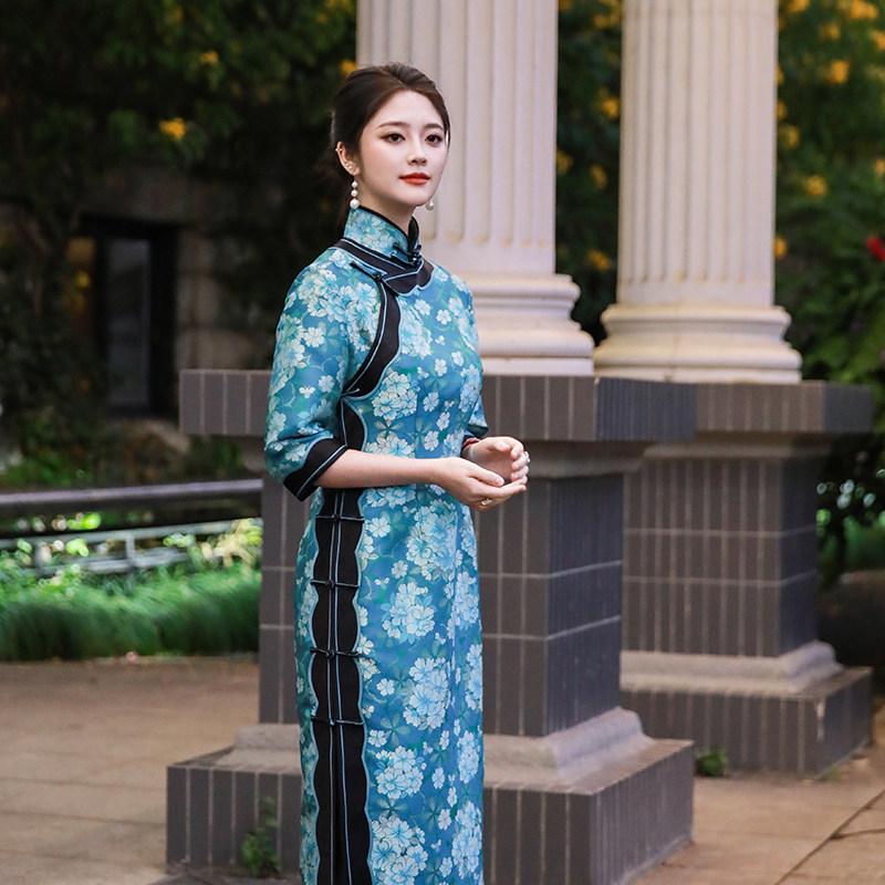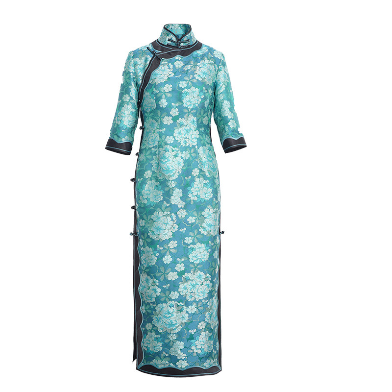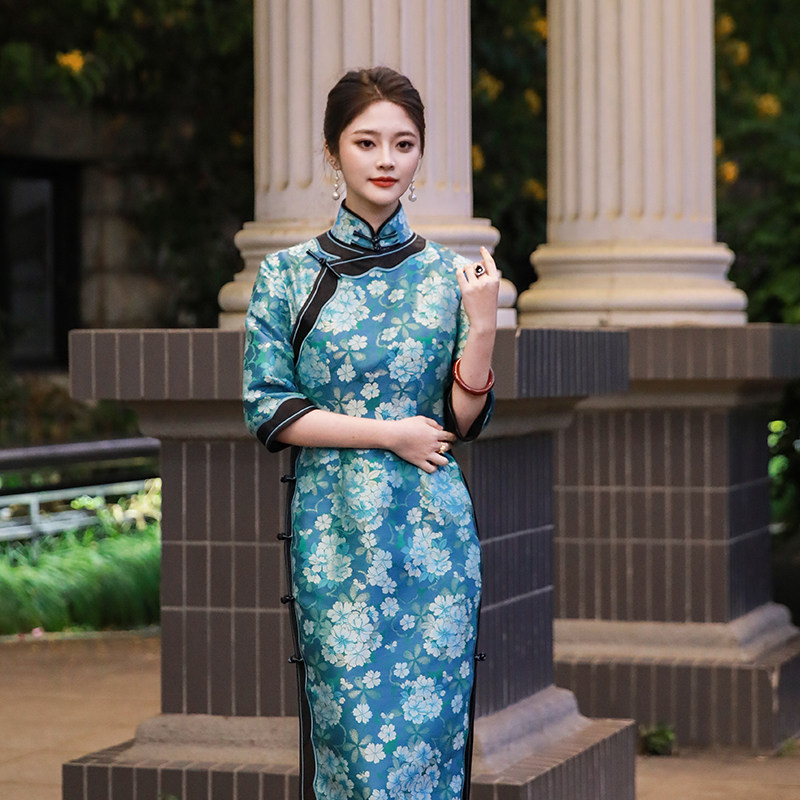 青花时光三重门真丝织金宋锦中式修身旗袍桑蚕丝复古长款民国风女