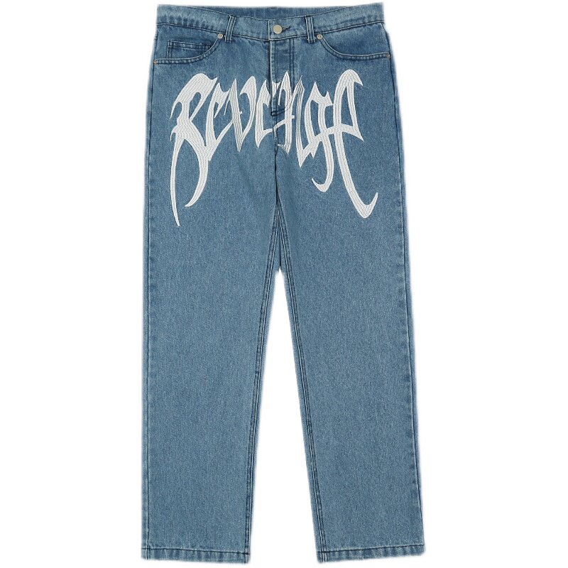 Revenge美式街头刺绣字母LOGO长裤水洗做旧嘻哈工装直筒牛仔裤潮
