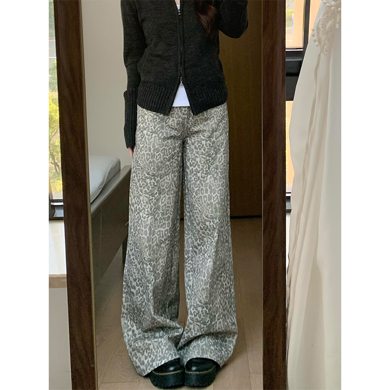大码美式高个子显瘦豹纹阔腿宽松牛仔裤女秋冬2025新款修身直筒裤