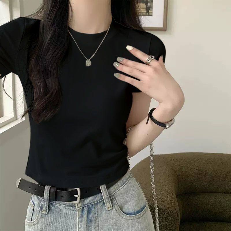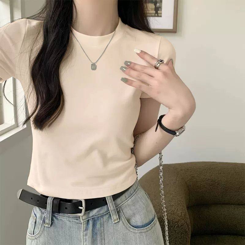 2025新款夏季正肩纯色短袖t恤女小个子上衣独特别致短款洋气卡腰