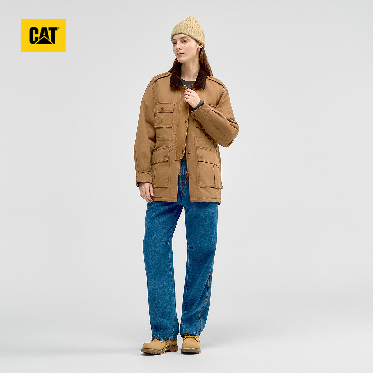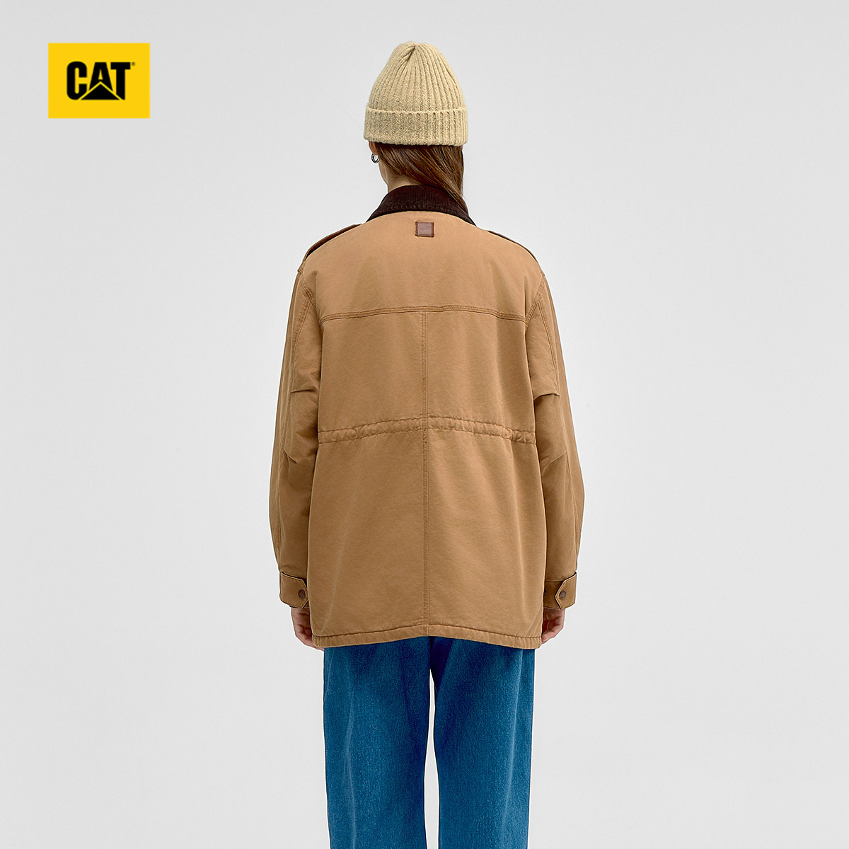 CAT卡特2025秋冬新品女士复古工装中长款灯芯绒翻领棉服商场同款
