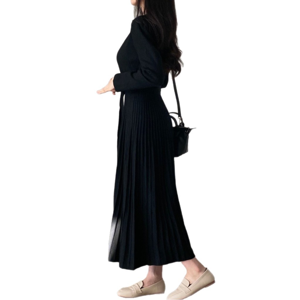 现货 韩国 ins 秋冬 绑带收腰显瘦 中长款 针织连衣裙毛衣新款v