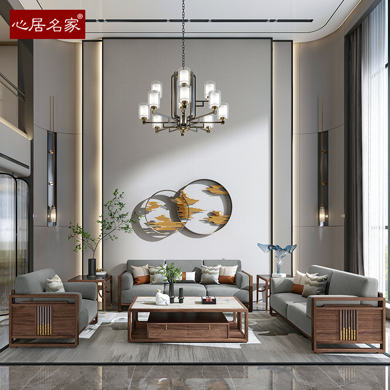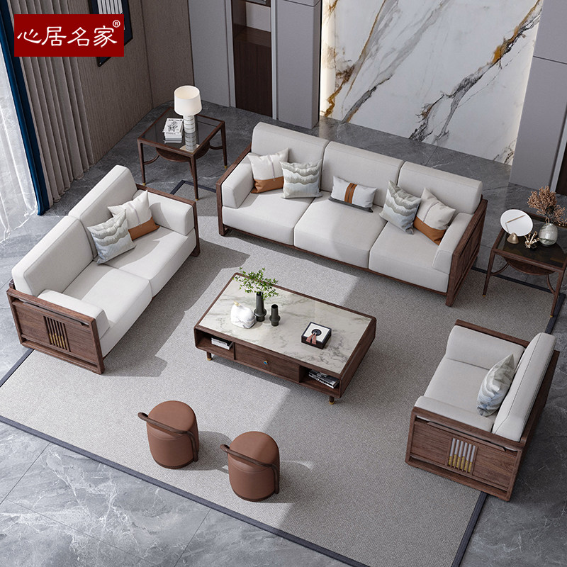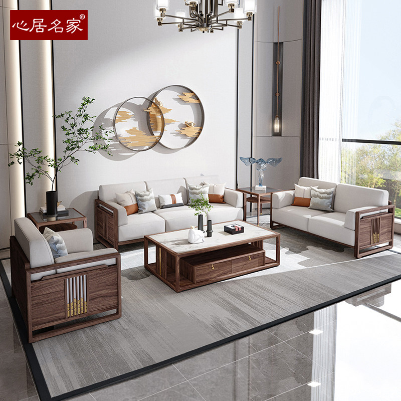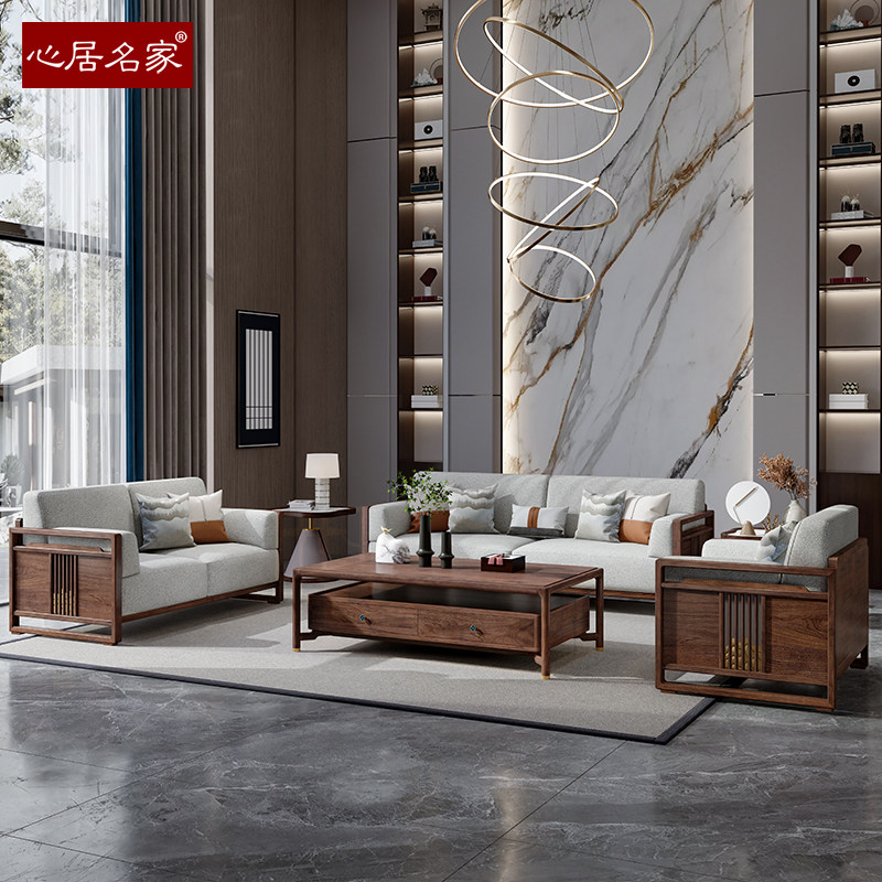 心居名家新中式实木沙发组合头层真皮客厅进口楠木124布艺楠图