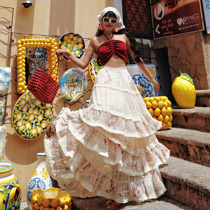 麦叙原创《甜桃舞会》法式甜美蕾丝雪纺拼接蛋糕裙重工半身裙长裙