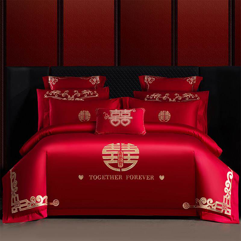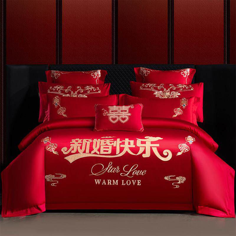 高端婚庆四件组大红色全棉刺绣喜被套床单结婚房嫁礼房床上用品欧