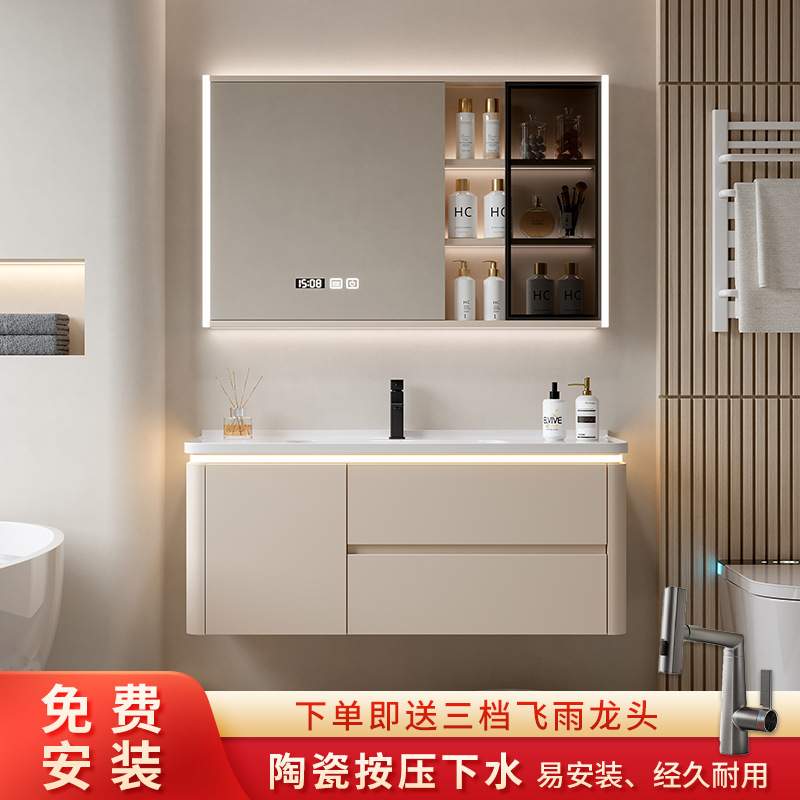 奶油风陶瓷一体盆圆角浴室柜组合卫生间洗漱台洗手池洗脸盆洗面柜