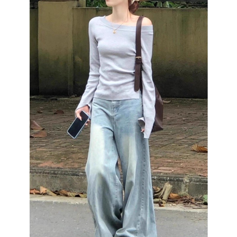 灰色性感斜肩长袖针织打底衫早秋