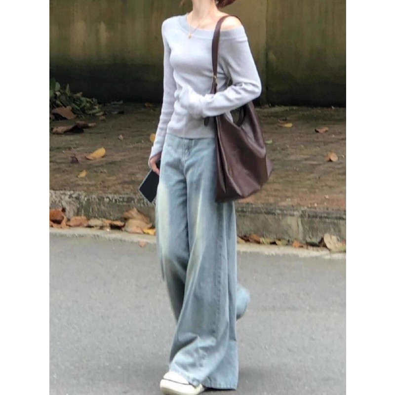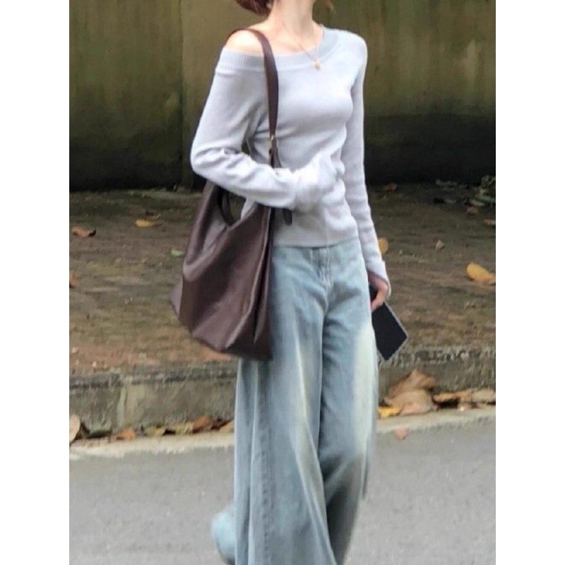 斜肩长袖针织内搭打底衫女装早秋季韩系毛衣修身露肩独特漂亮上衣