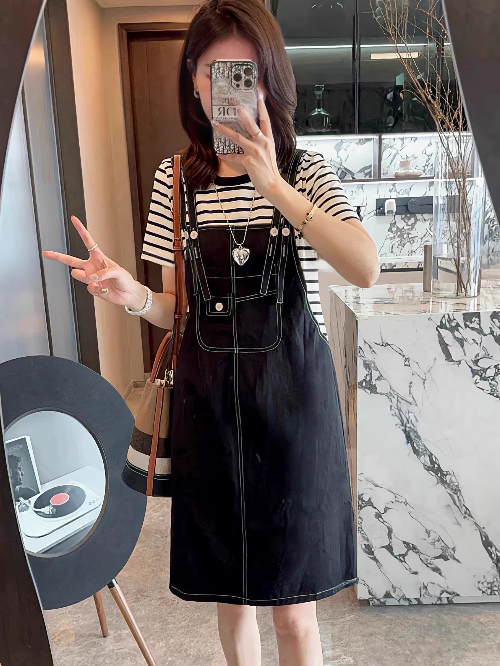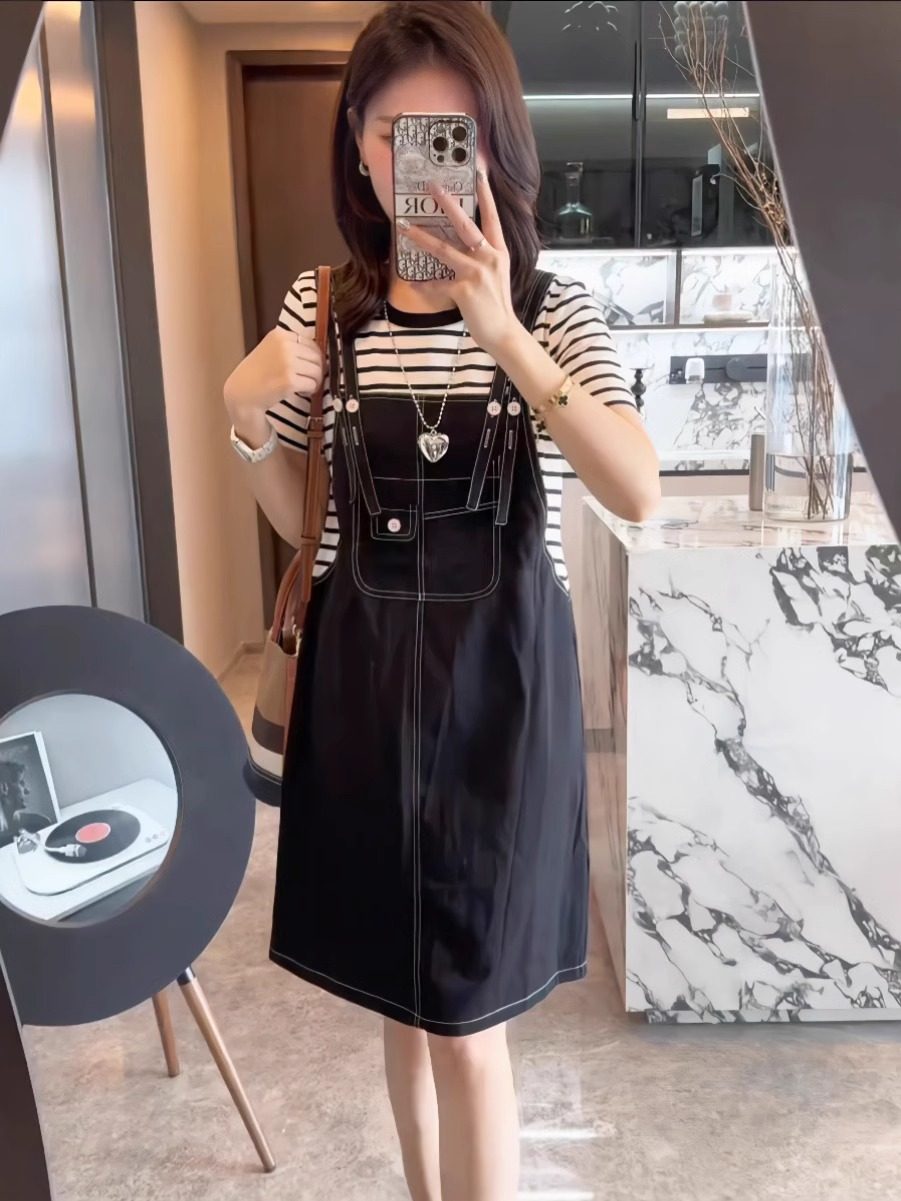 韩系撞色拼接条纹假两件连衣裙女2025夏季新款减龄遮肉显瘦背带裙