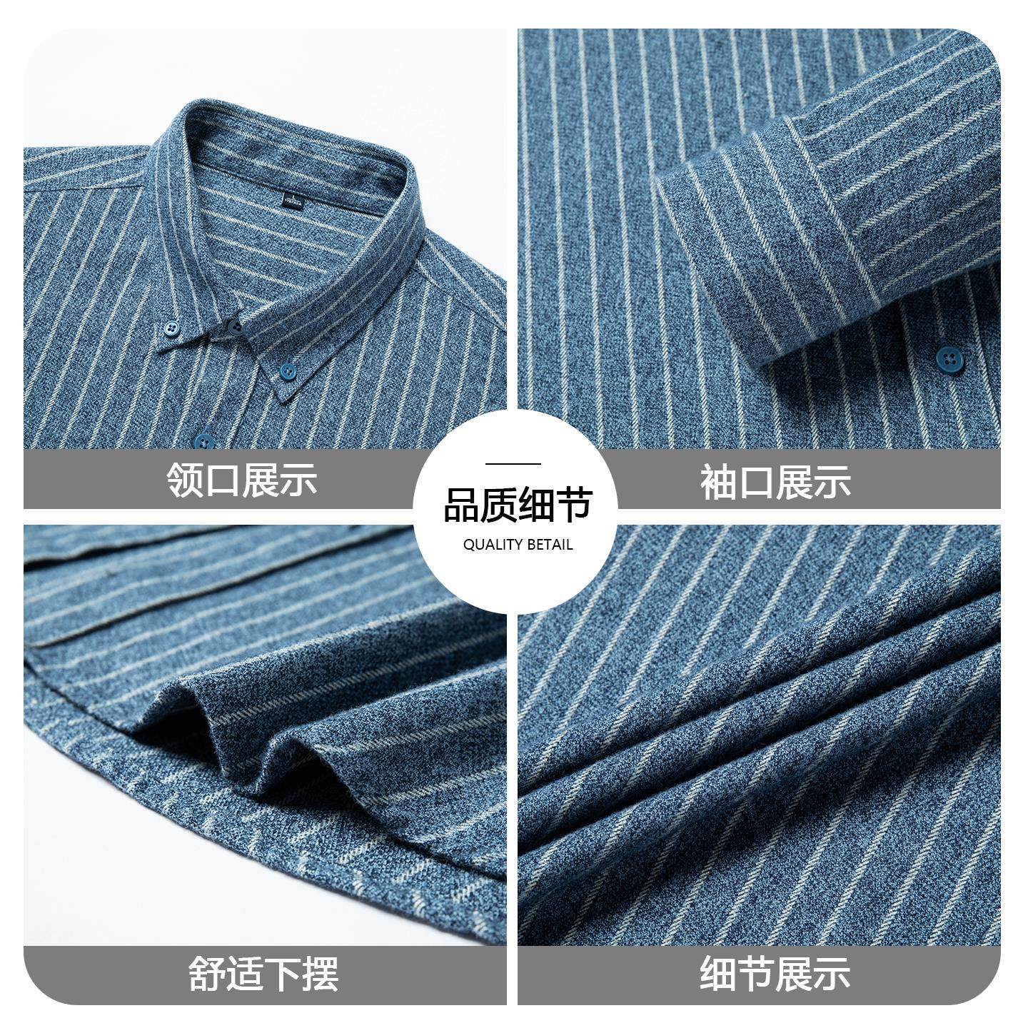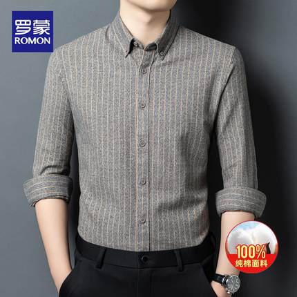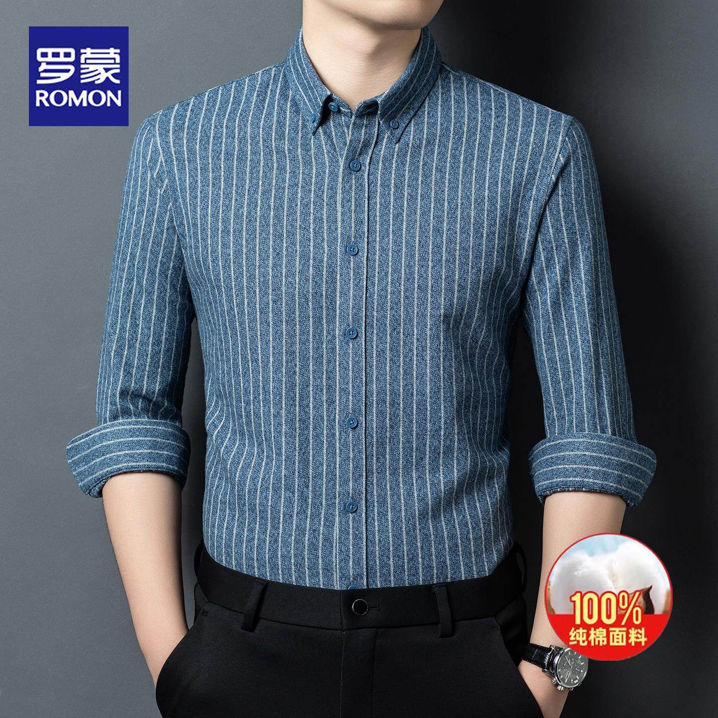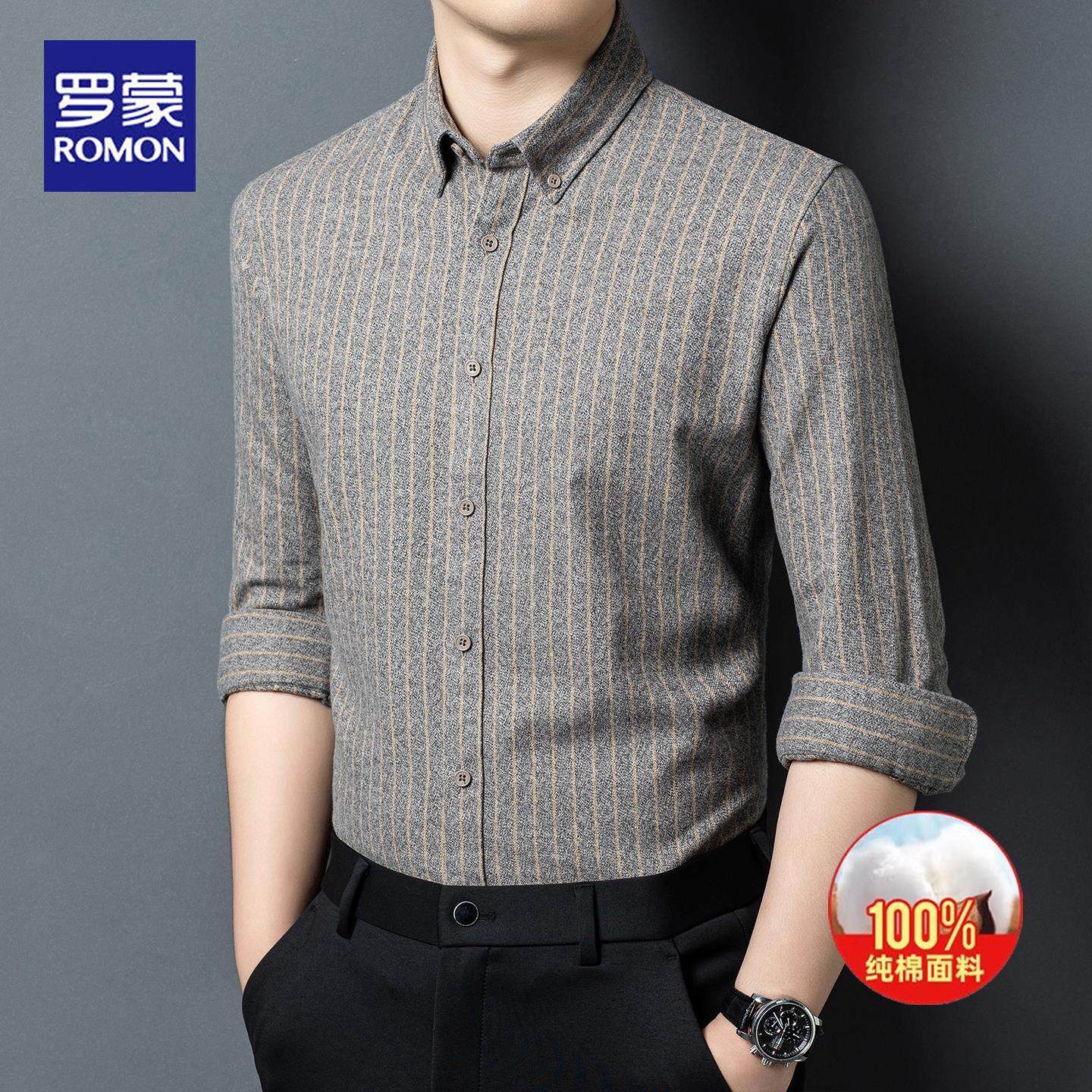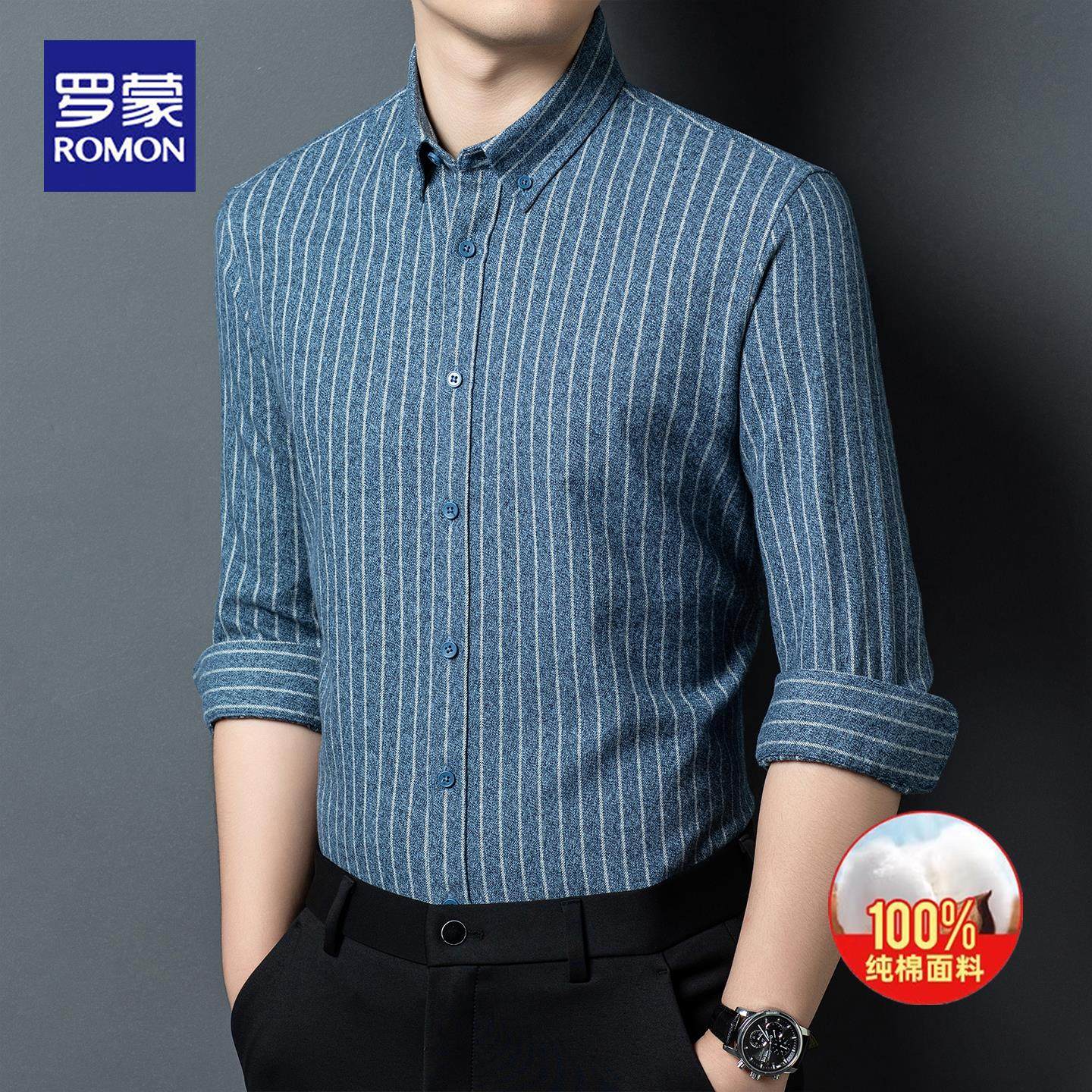 罗蒙纯棉长袖衬衫男士春秋新款商务休闲条纹亲肤舒适免烫弹力衬衣