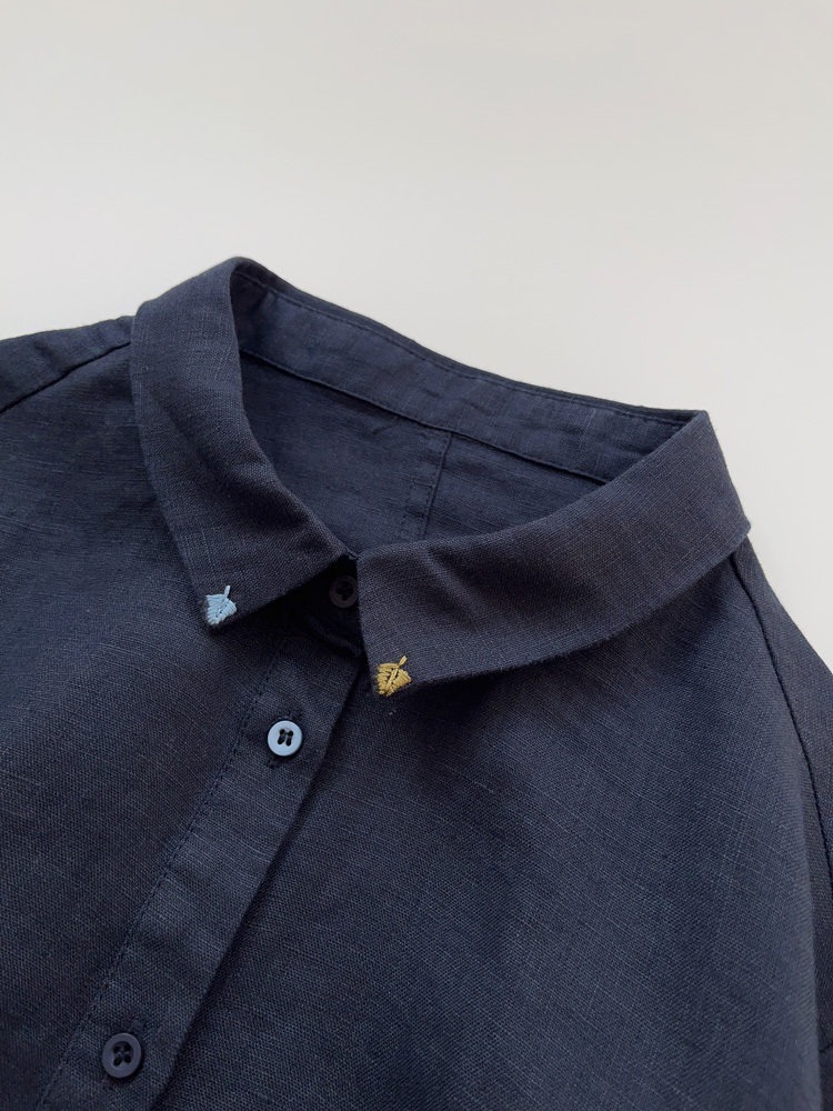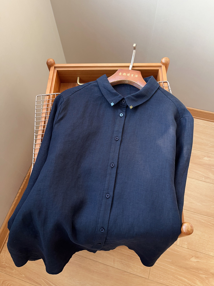 日系小众藏青色亚麻衬衫女春季通勤百搭麻料衬衣减龄打底长袖上衣