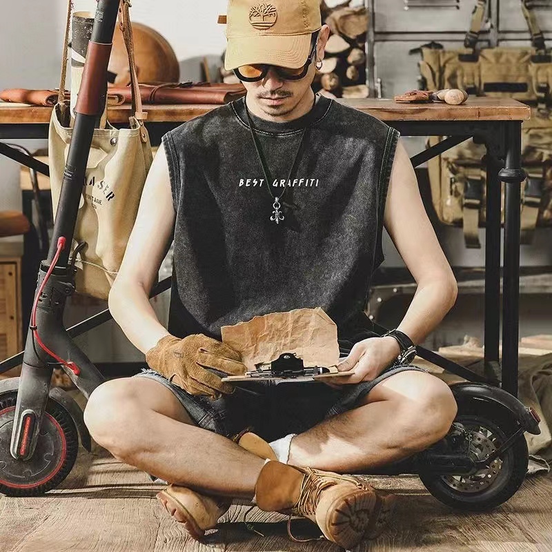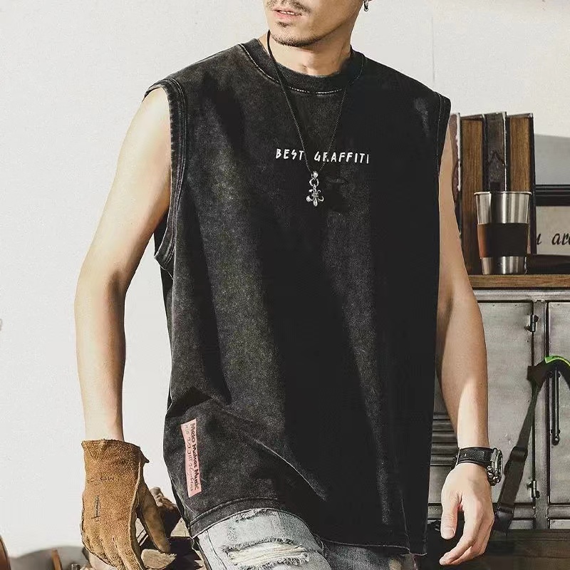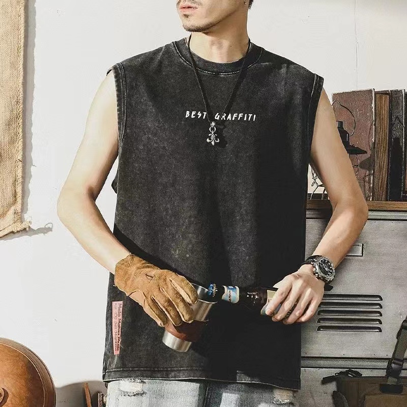 美式蜡染雪花复古水洗重磅纯棉背心男宽松潮牌ins坎肩短袖T恤男装
