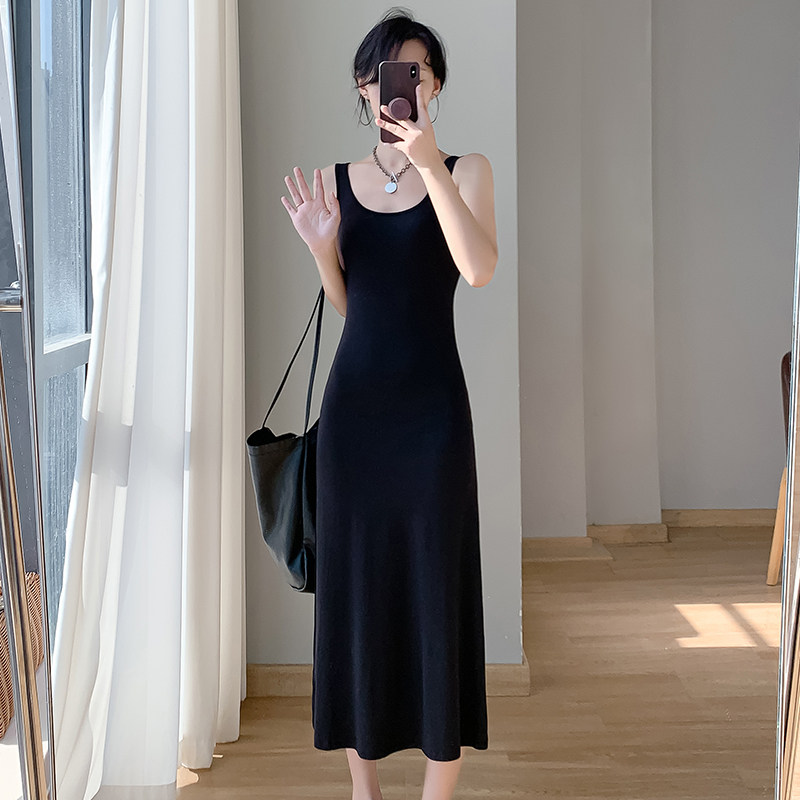 2025夏季莫代尔圆领法式背心过膝长裙温柔百搭黑色显瘦连衣裙女潮