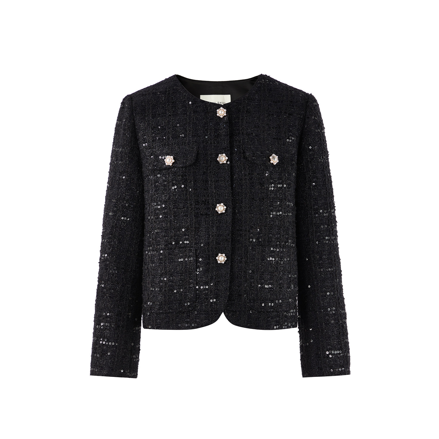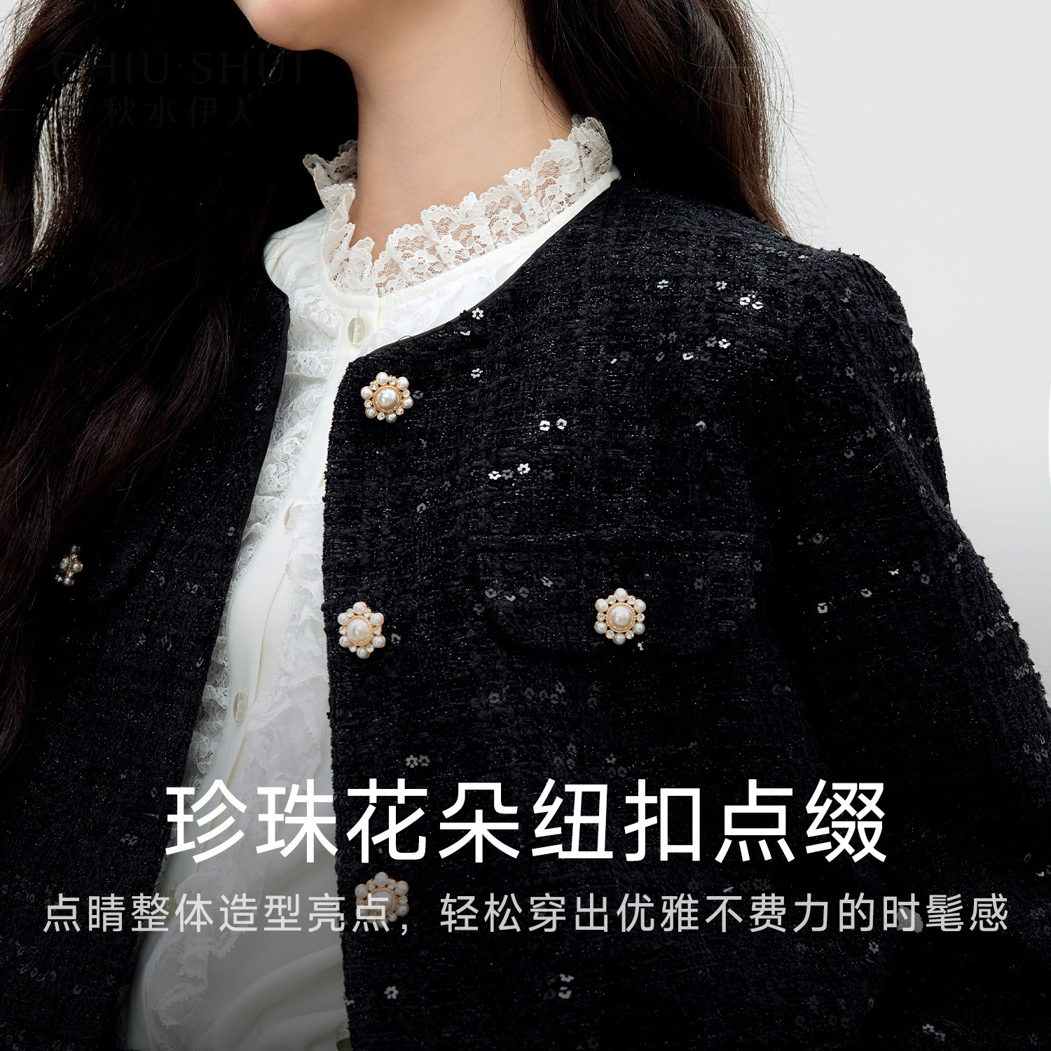 秋水伊人小香风短款外套女2026年春季新款经典黑色亮片时尚上衣