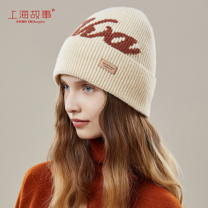 上海故事美式字母毛线帽子女秋冬双层加厚保暖防寒护耳针织帽冷帽