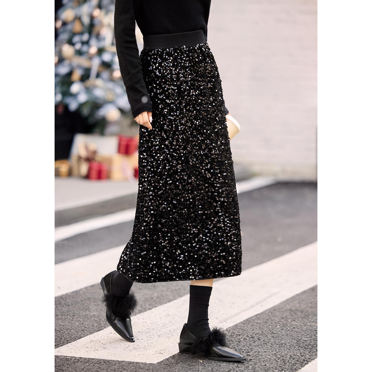 【博主同款】XWI欣未重工珠片绣半身裙女2024冬季高腰开衩直筒裙