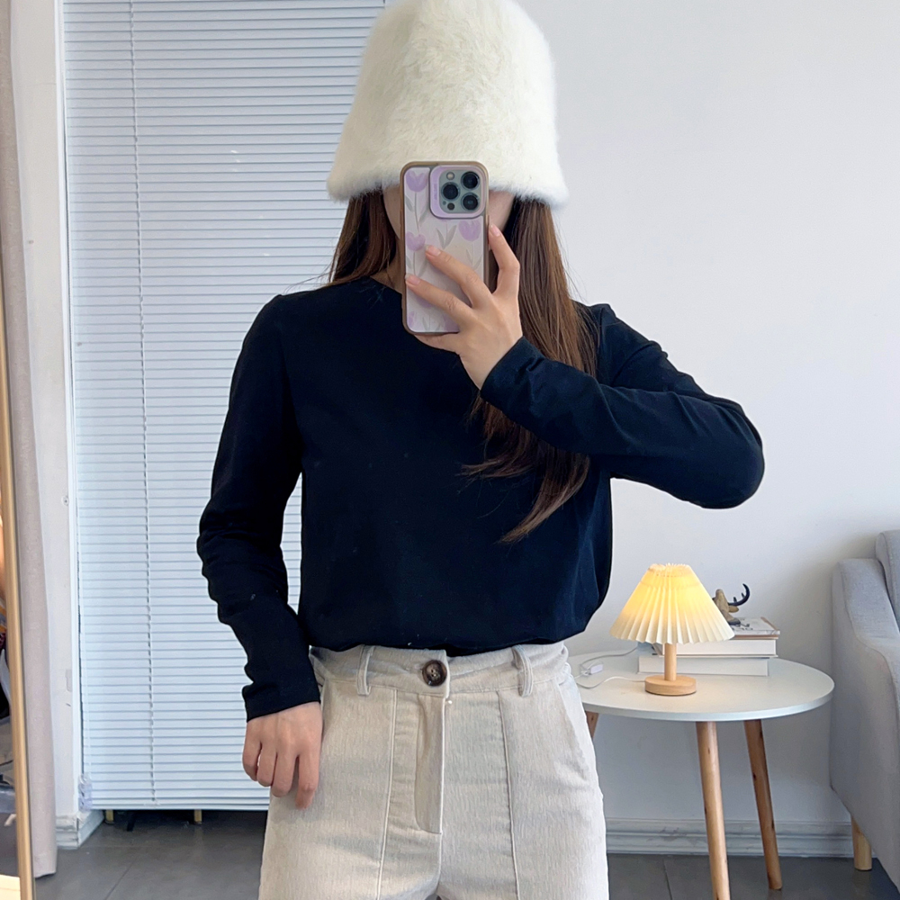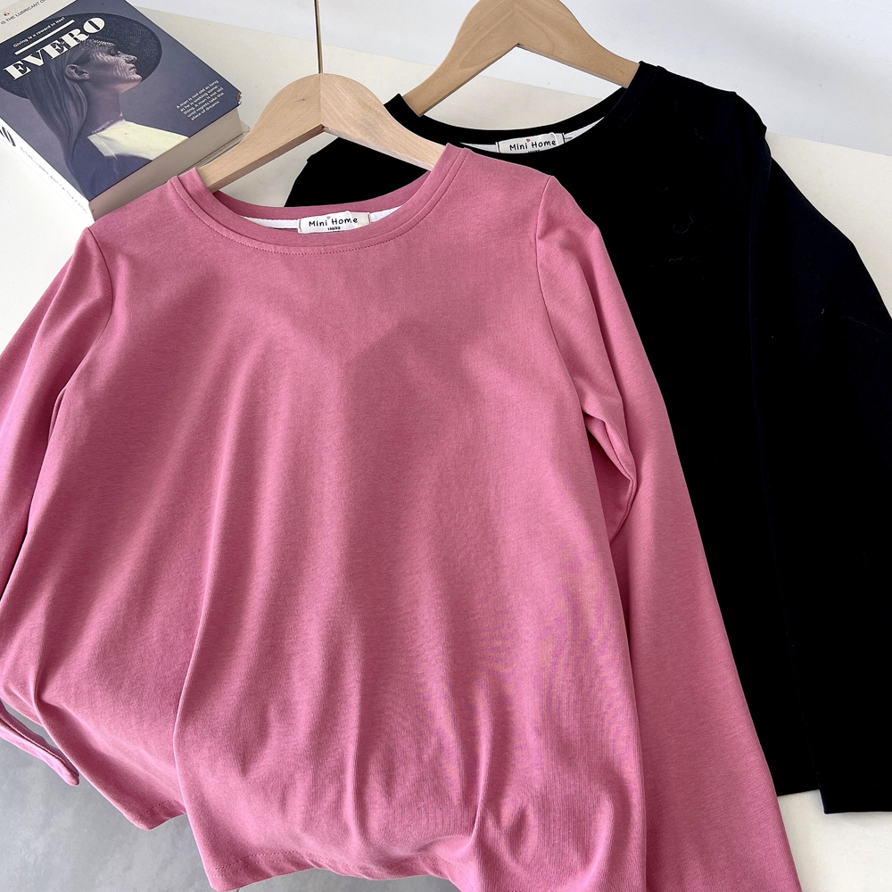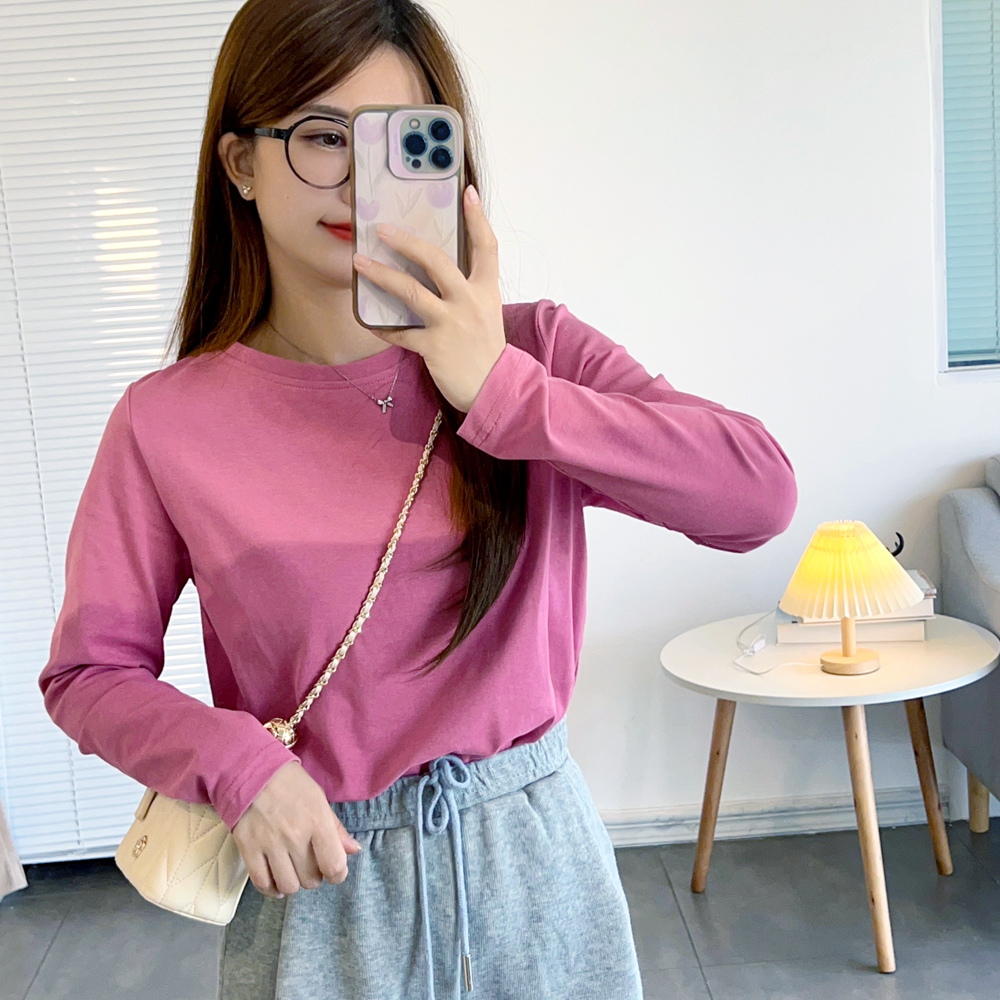 150小个子时尚百搭纯色纯棉薄款打底外穿圆领修身长袖T恤女装春秋