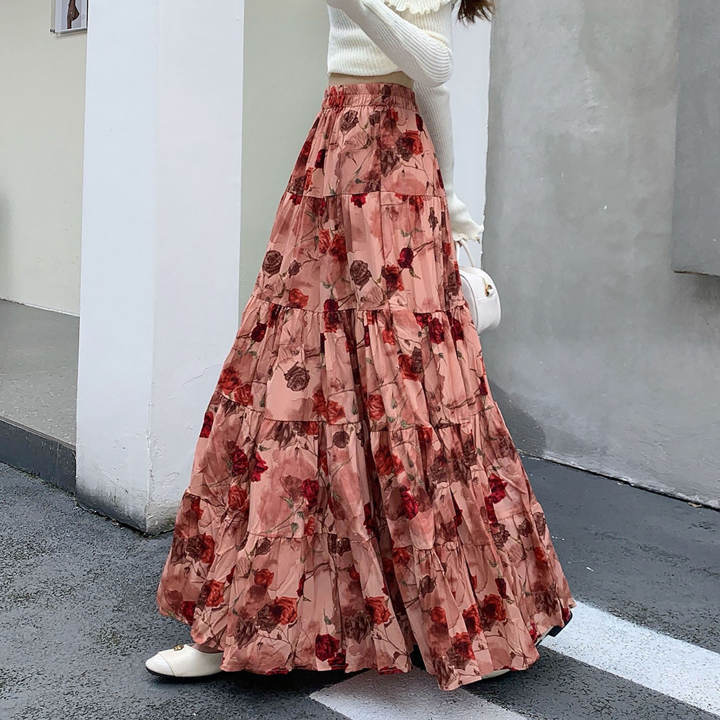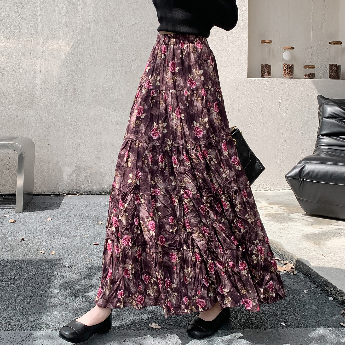 复古碎花半身裙垂感褶皱长裙女秋冬2025高腰遮胯显瘦中长款大摆裙