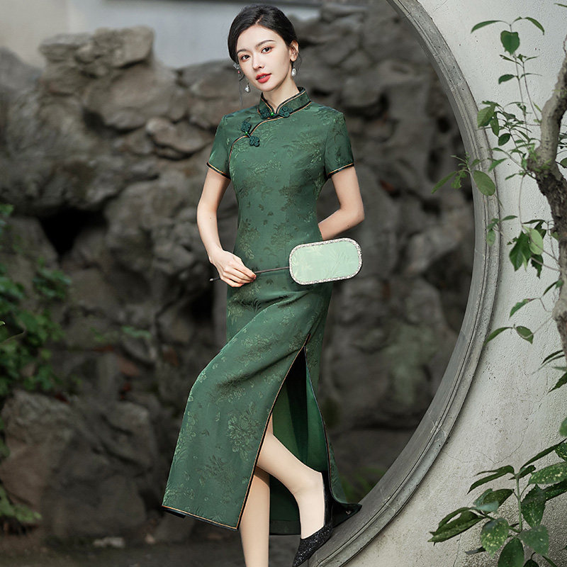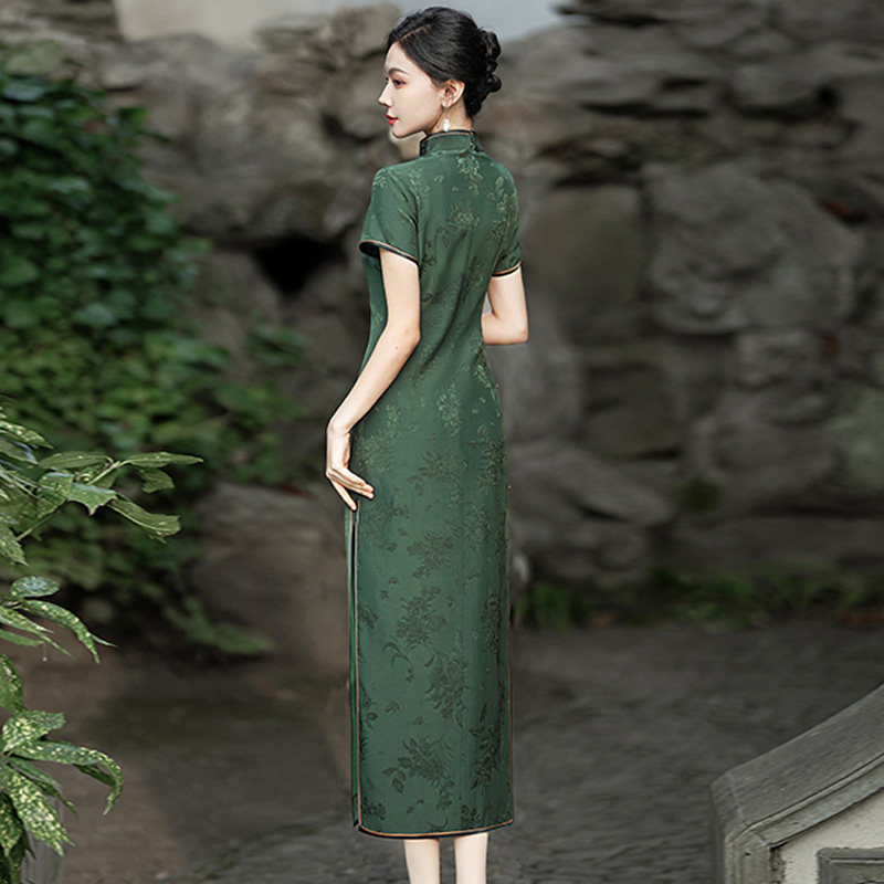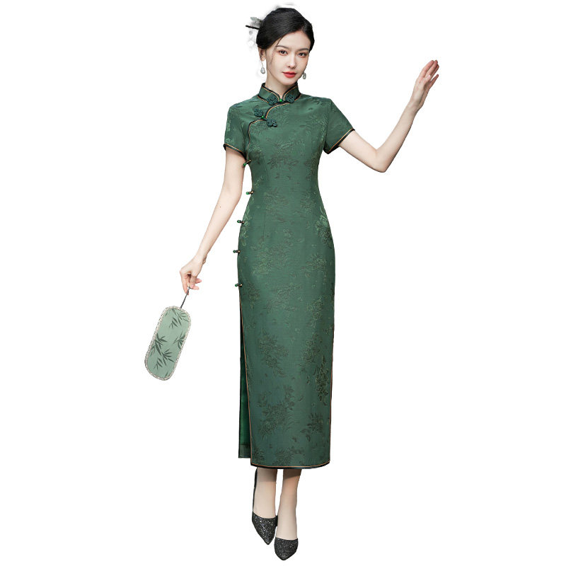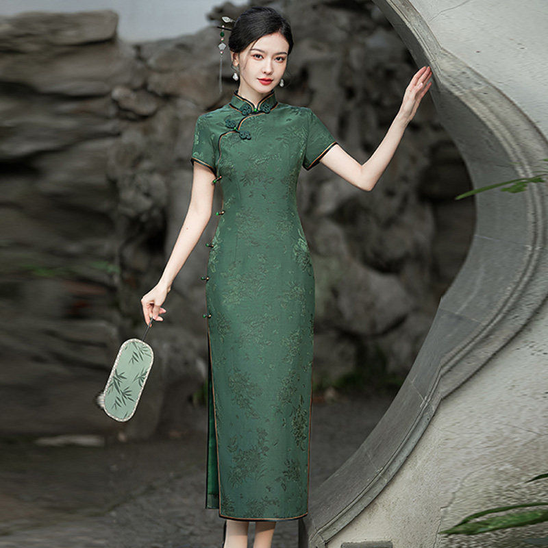 新中式高端真丝旗袍长款夏季新款复古民国风改良桑蚕丝连衣裙绿色