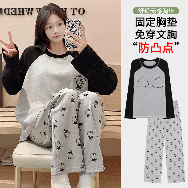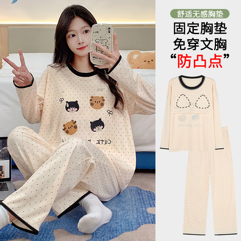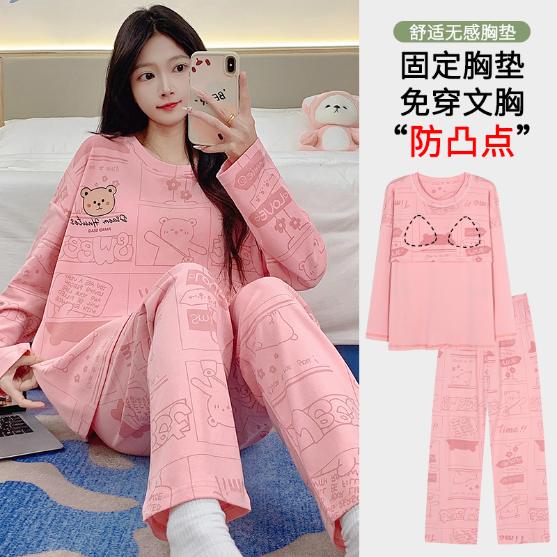 带胸垫睡衣女款春秋冬长袖纯棉胖mm免穿文胸特大码200斤套装220斤