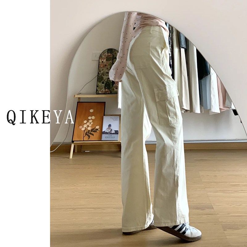 美式米杏色工装牛仔裤女2025春秋新款高腰宽松阔腿休闲窄版直筒裤