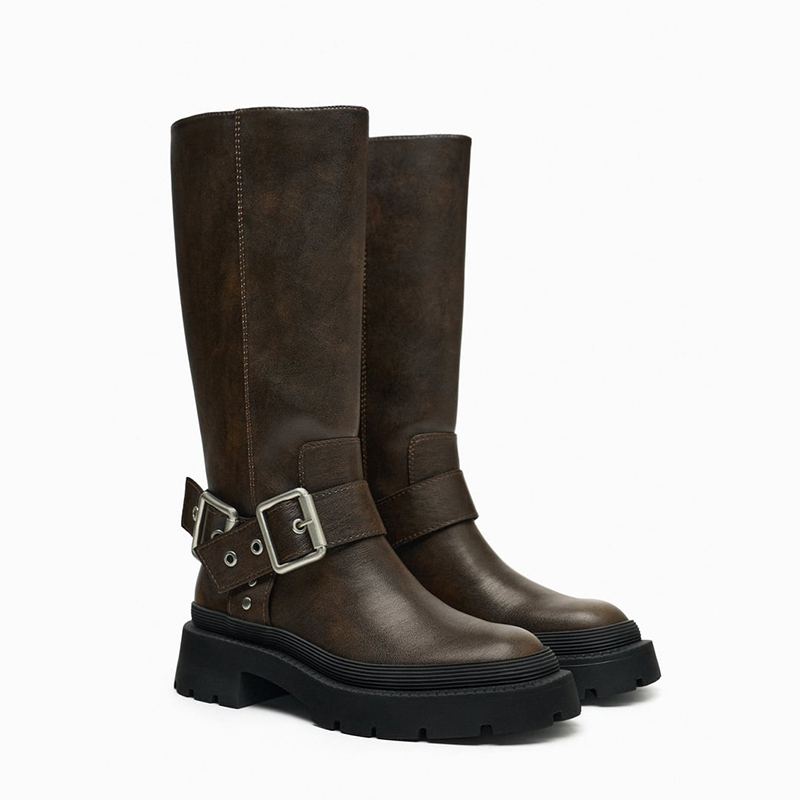 ZA2025新款高跟英伦风骑士靴粗跟厚底高筒靴厚底圆头不过膝长筒靴