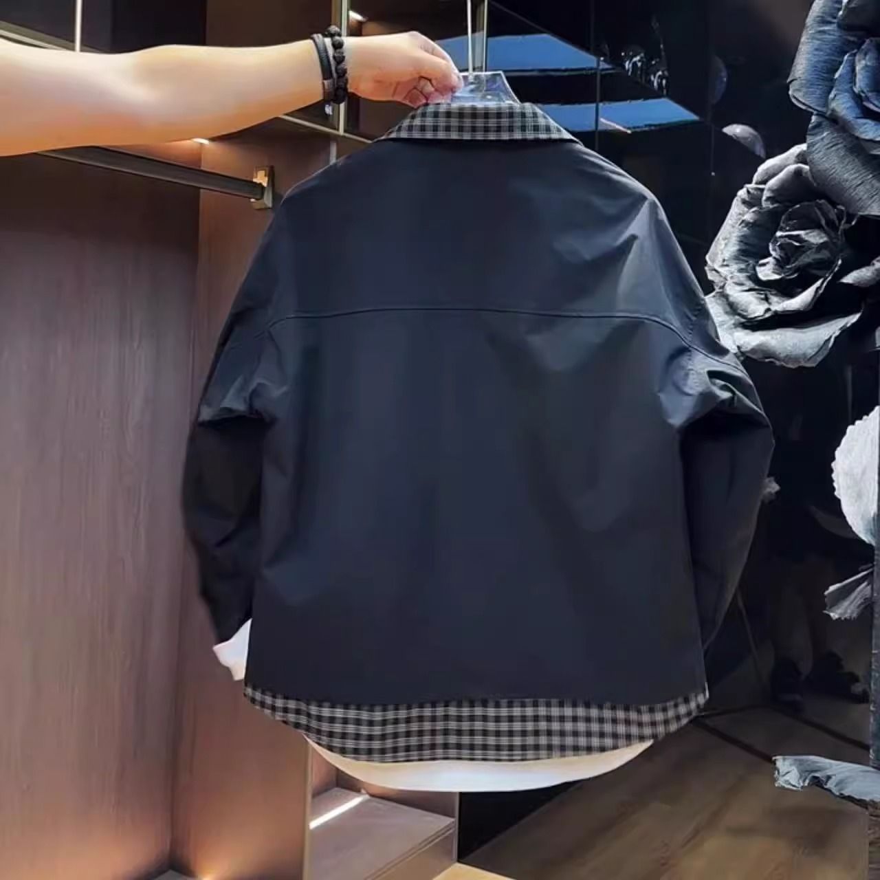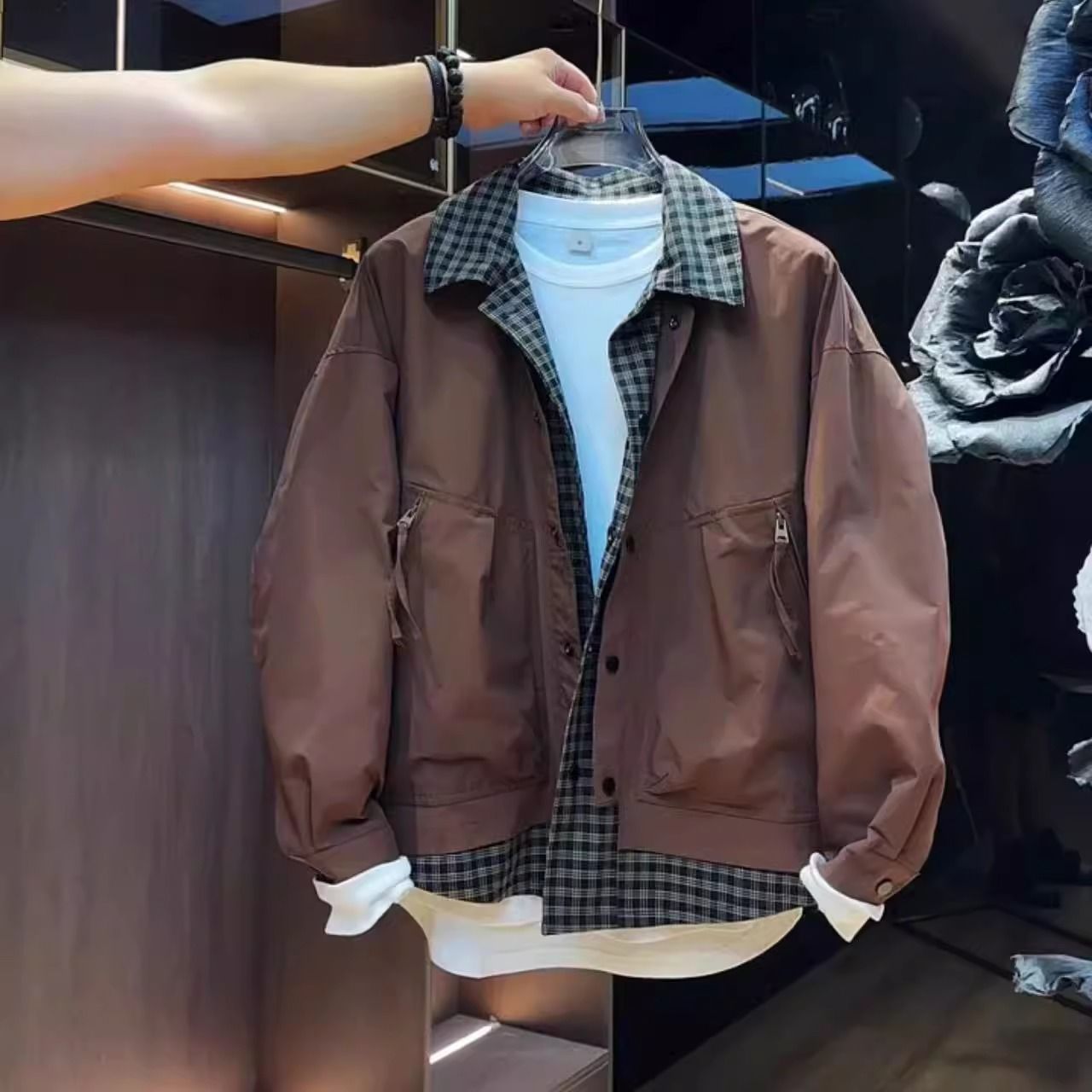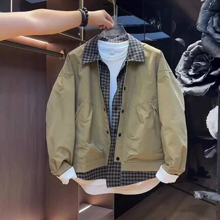 假两件工装翻领格子外套男秋季韩版潮流宽松上衣青年痞帅休闲夹克