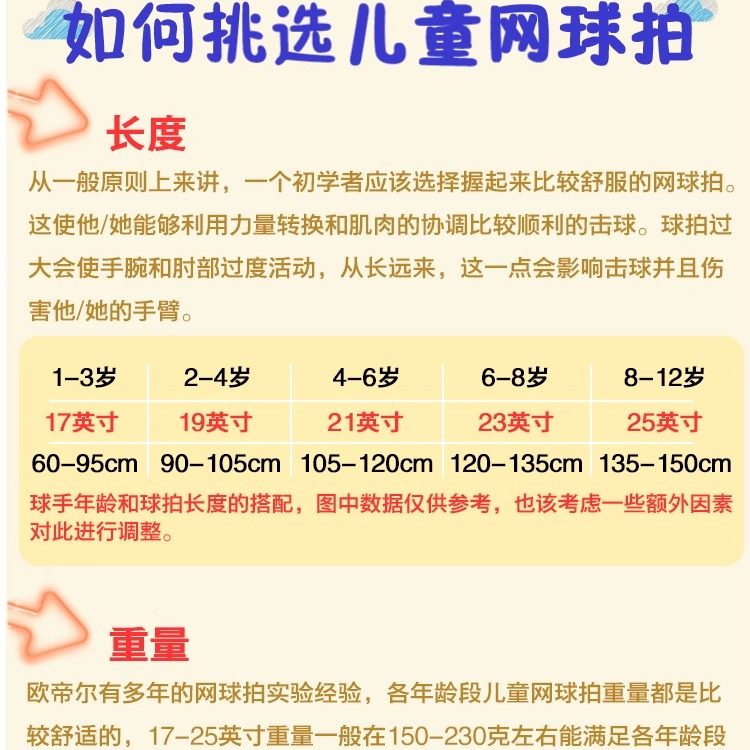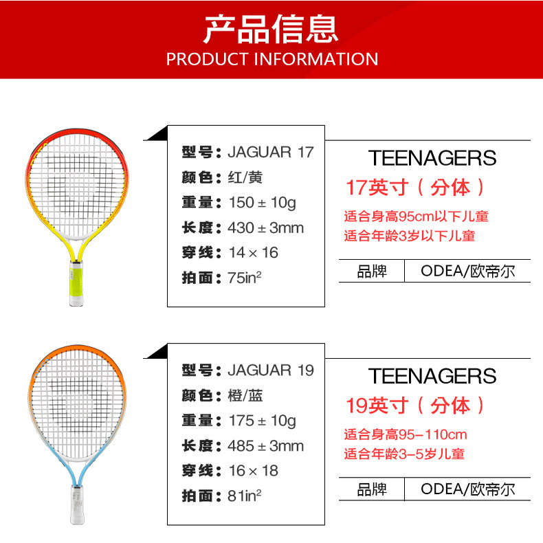 欧帝尔儿童网球拍17/19/21/23/25英寸单人初学3-12岁小学生青少年