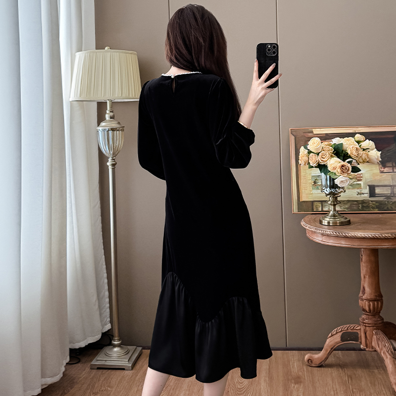 大码女装中长款连衣裙女2025年冬季新款外穿打底拼接手工钉珠裙子