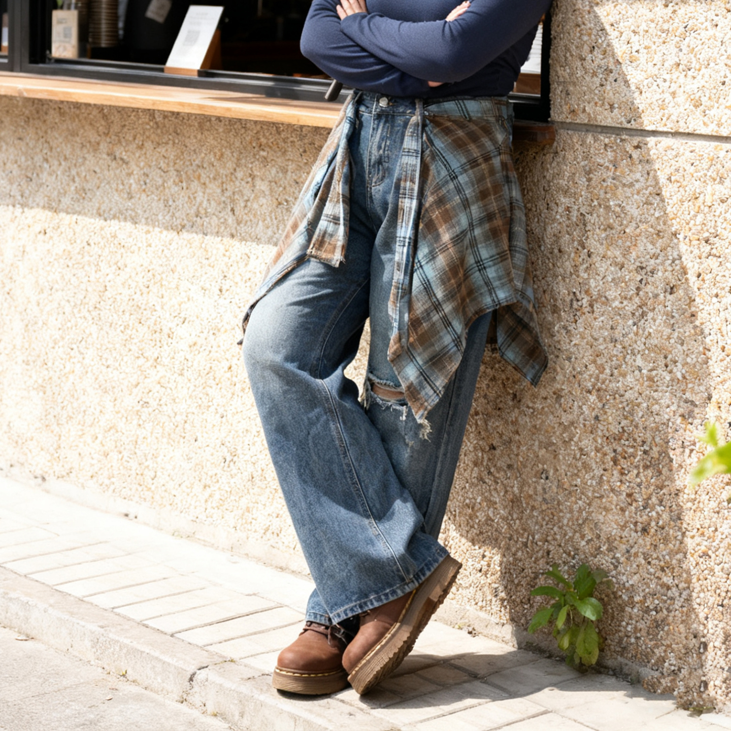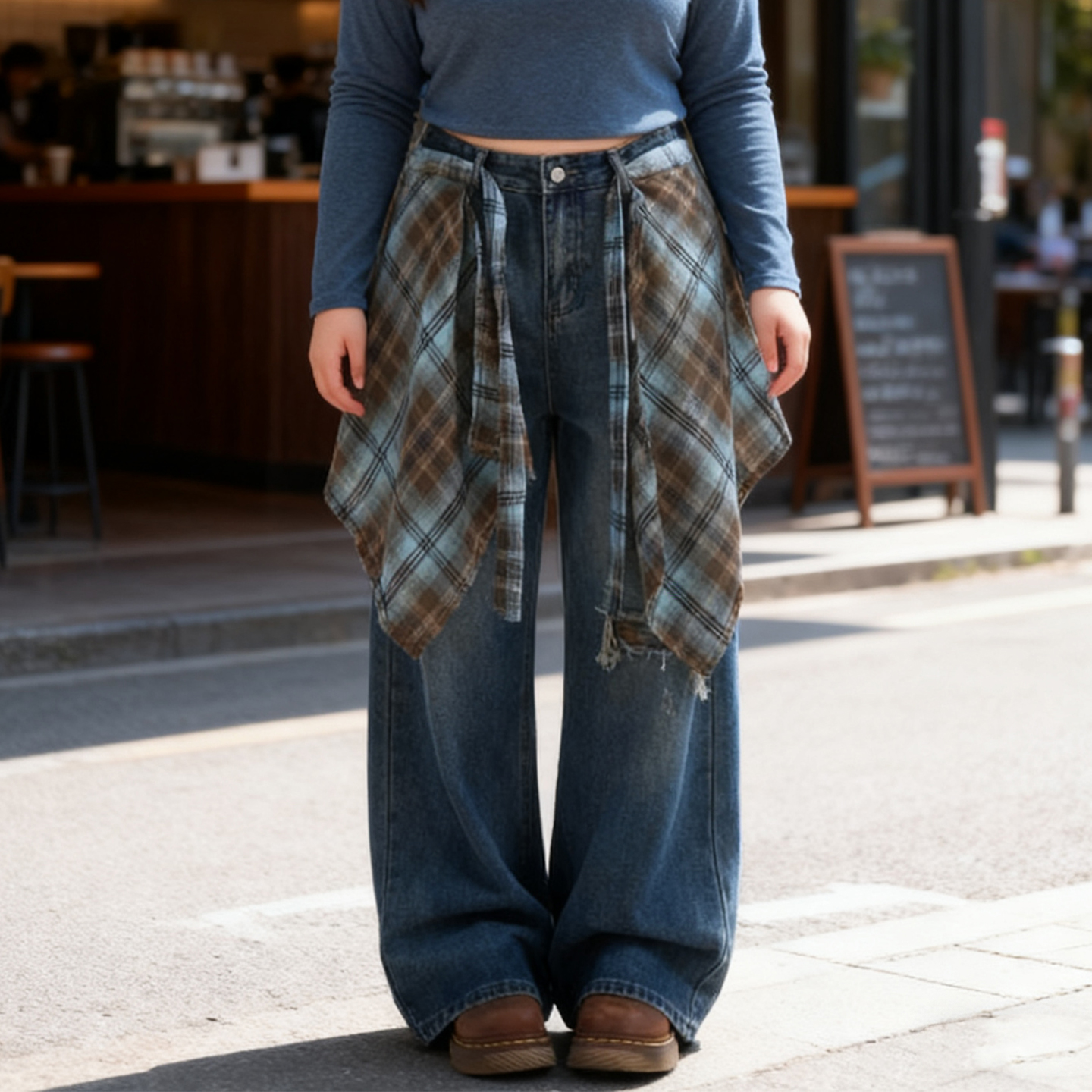 大码女装胖mm复古风可拆卸格子屁帘牛仔裤女宽松显瘦水洗阔腿裤子