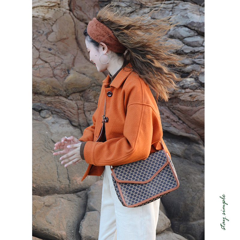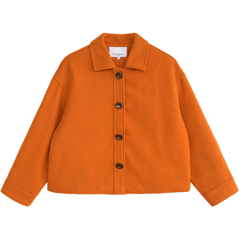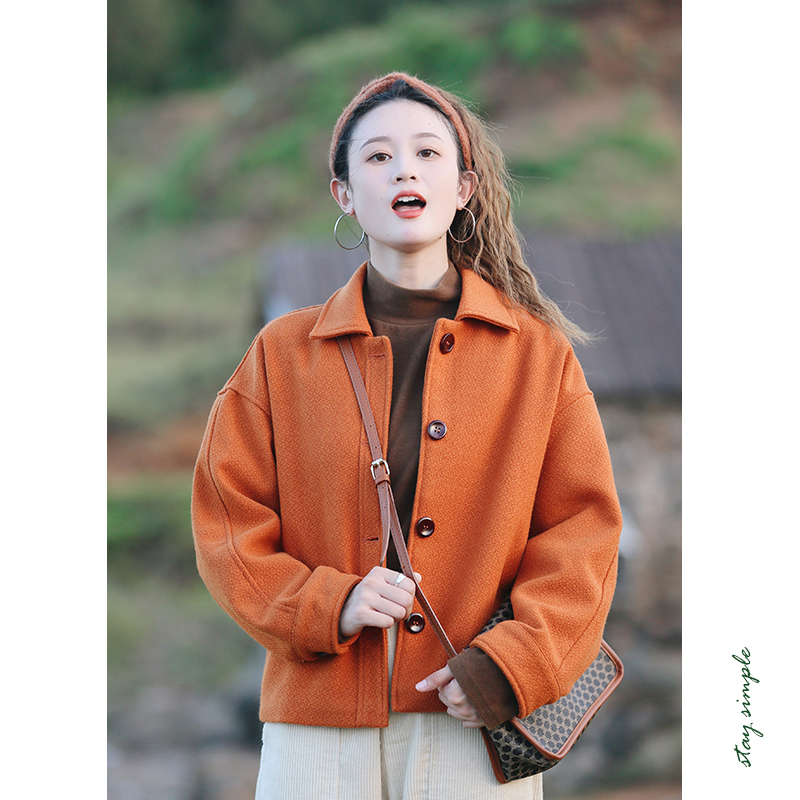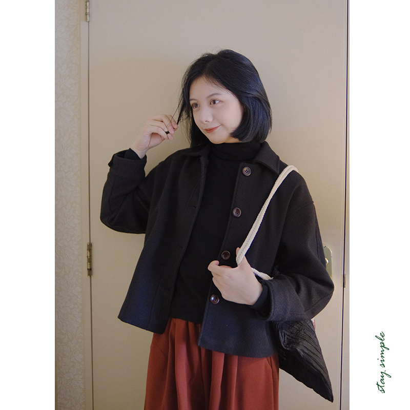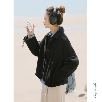 花吉B588黑色复古宽松直筒短款毛呢外套女2025新款秋冬学院风上衣