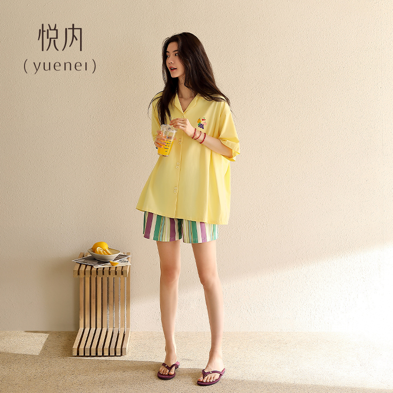 悦内带胸垫睡衣女款夏季夏天莫代尔短袖短裤家居服大码开衫可外穿