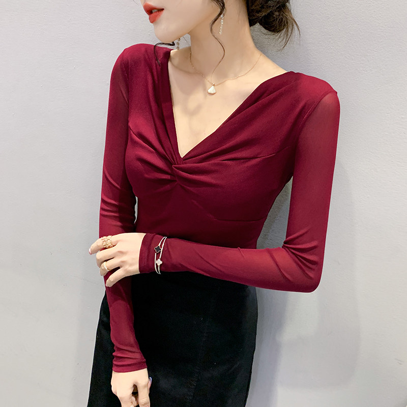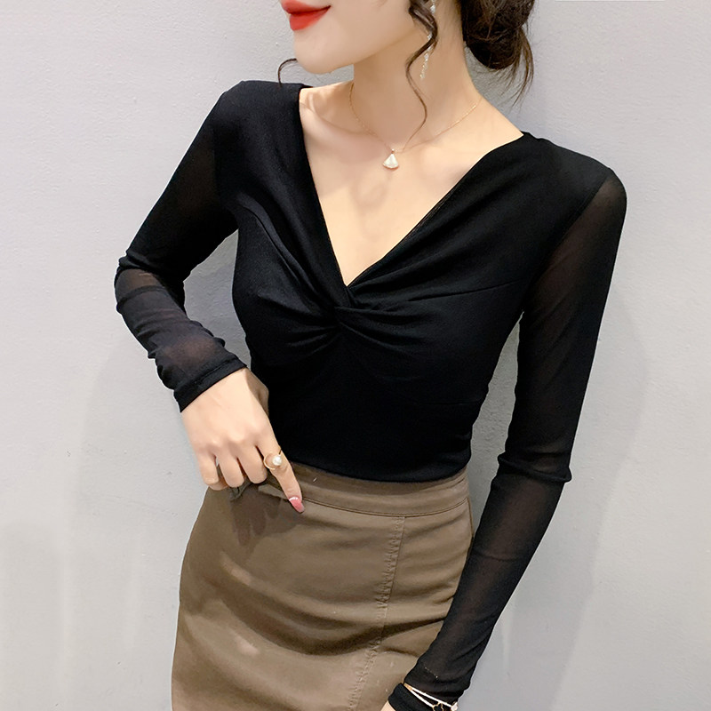 性感V领网纱长袖T恤女装2024春装新款欧货洋气豹纹上衣修身打底衫