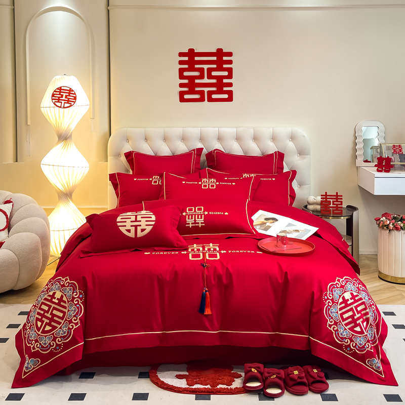160支长绒棉结婚四件套红色被套纯棉床单婚庆床上用品新婚房喜被4